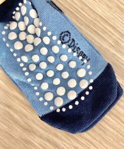 Calzino antiscivolo bambino, in morbido cotone, di colore blu con dettaglio antiscivolo di colore bianco.