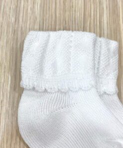 Calzino sanitario neonata in cotone, di colore bianco, con dettaglio di merletto a onde.