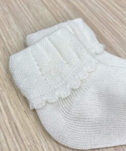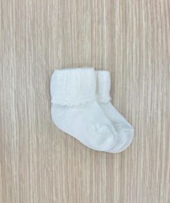 Calzino sanitario neonata in cotone, di colore panna, con dettaglio di merletto a onde.