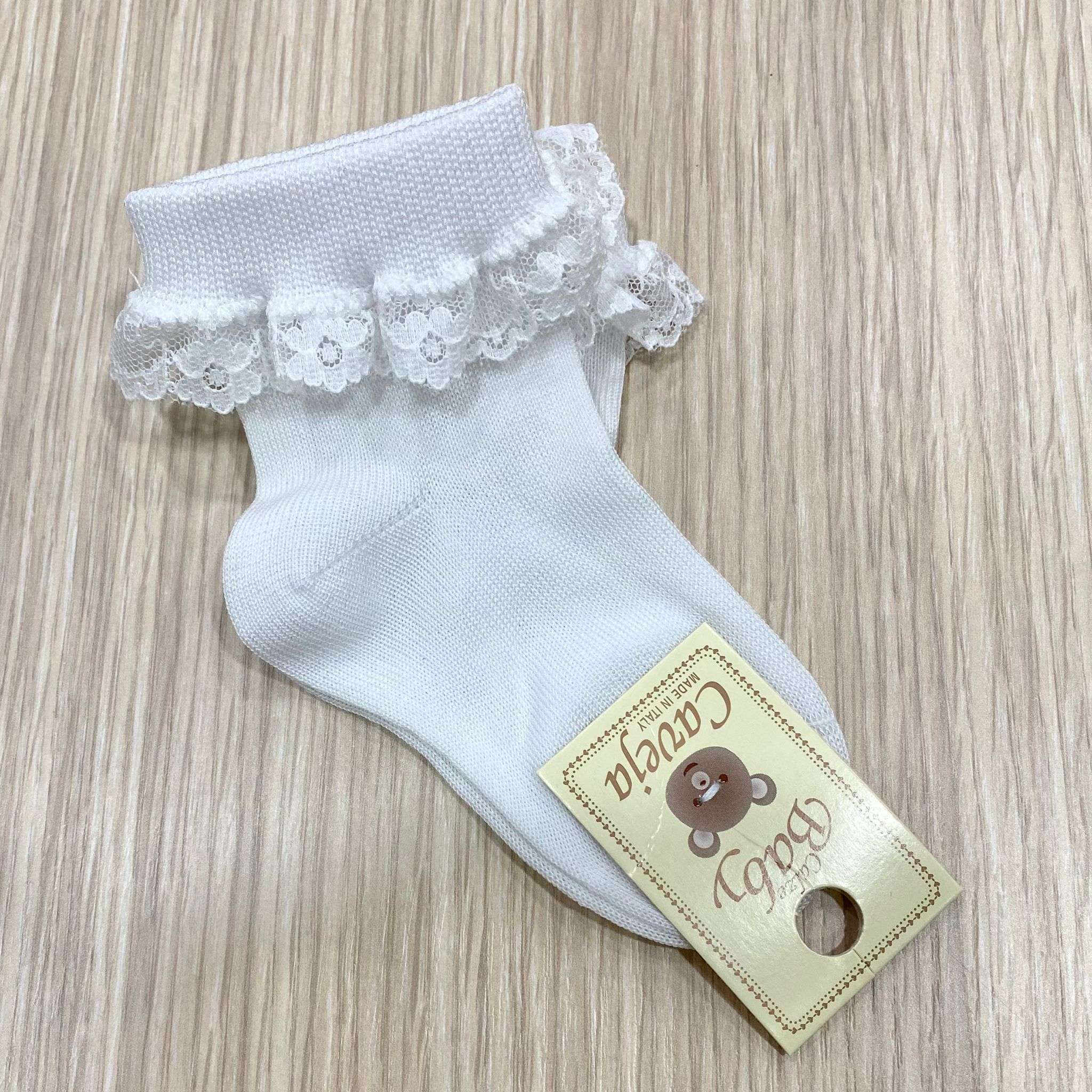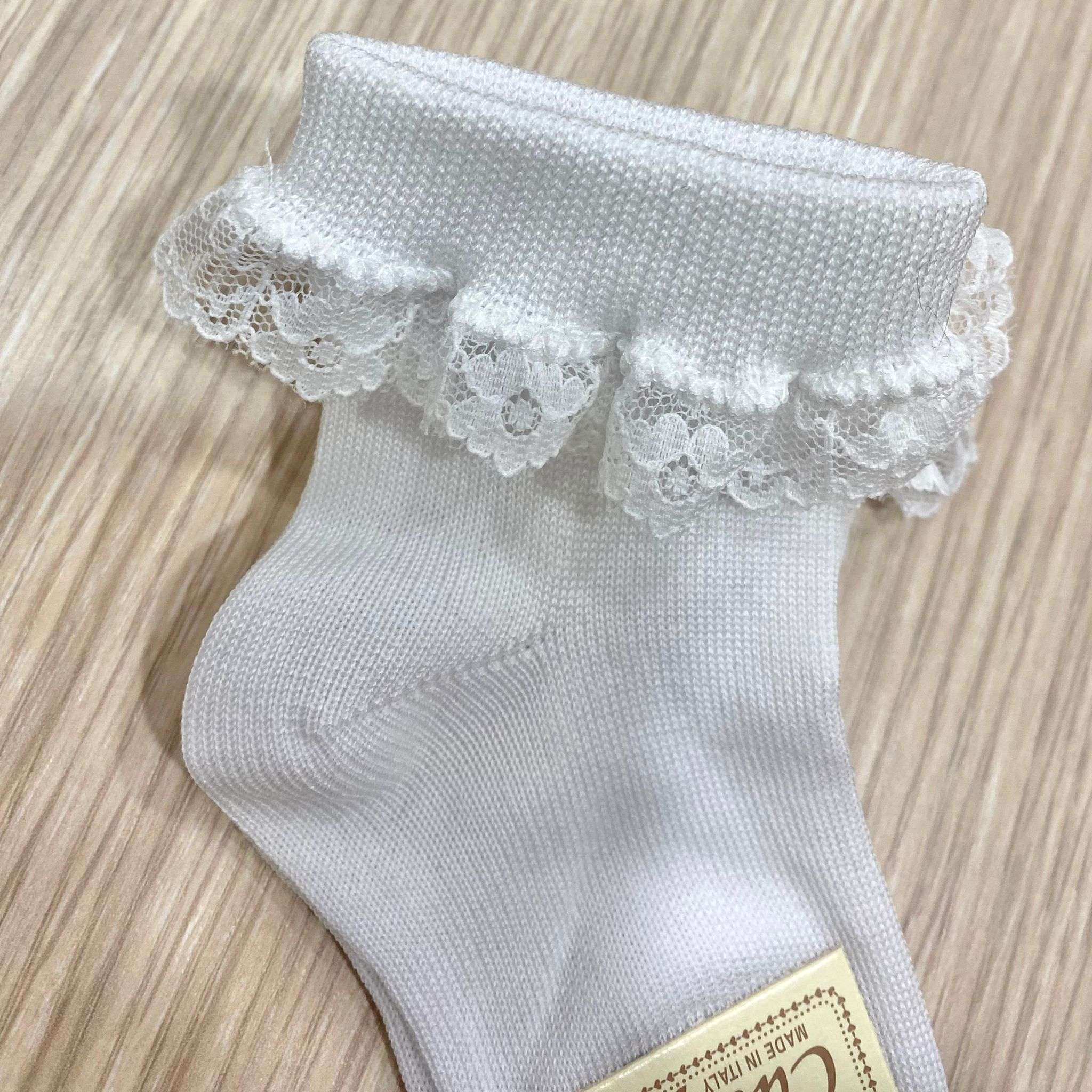 Calzino da cerimonia bambina in cotone, di colore bianco, con dettaglio di riccetto in macramè.