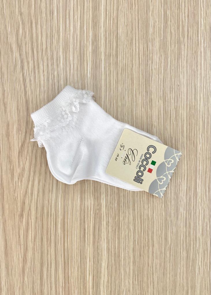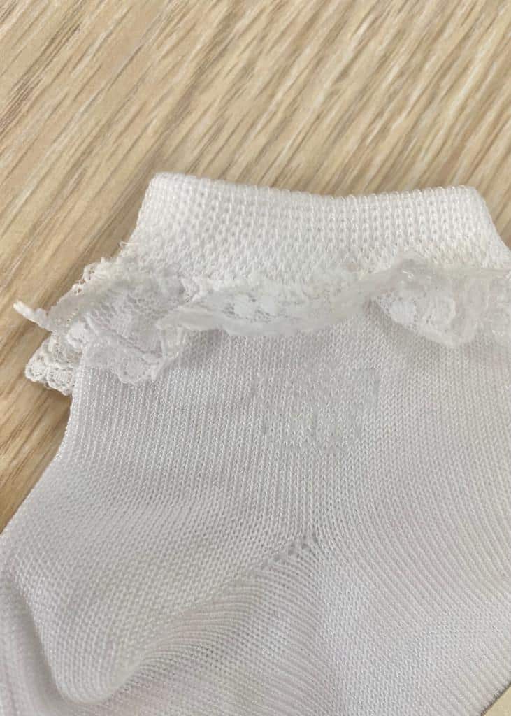 Calzino da cerimonia bambina in cotone, di colore bianco, con dettaglio di riccetto in macramè.