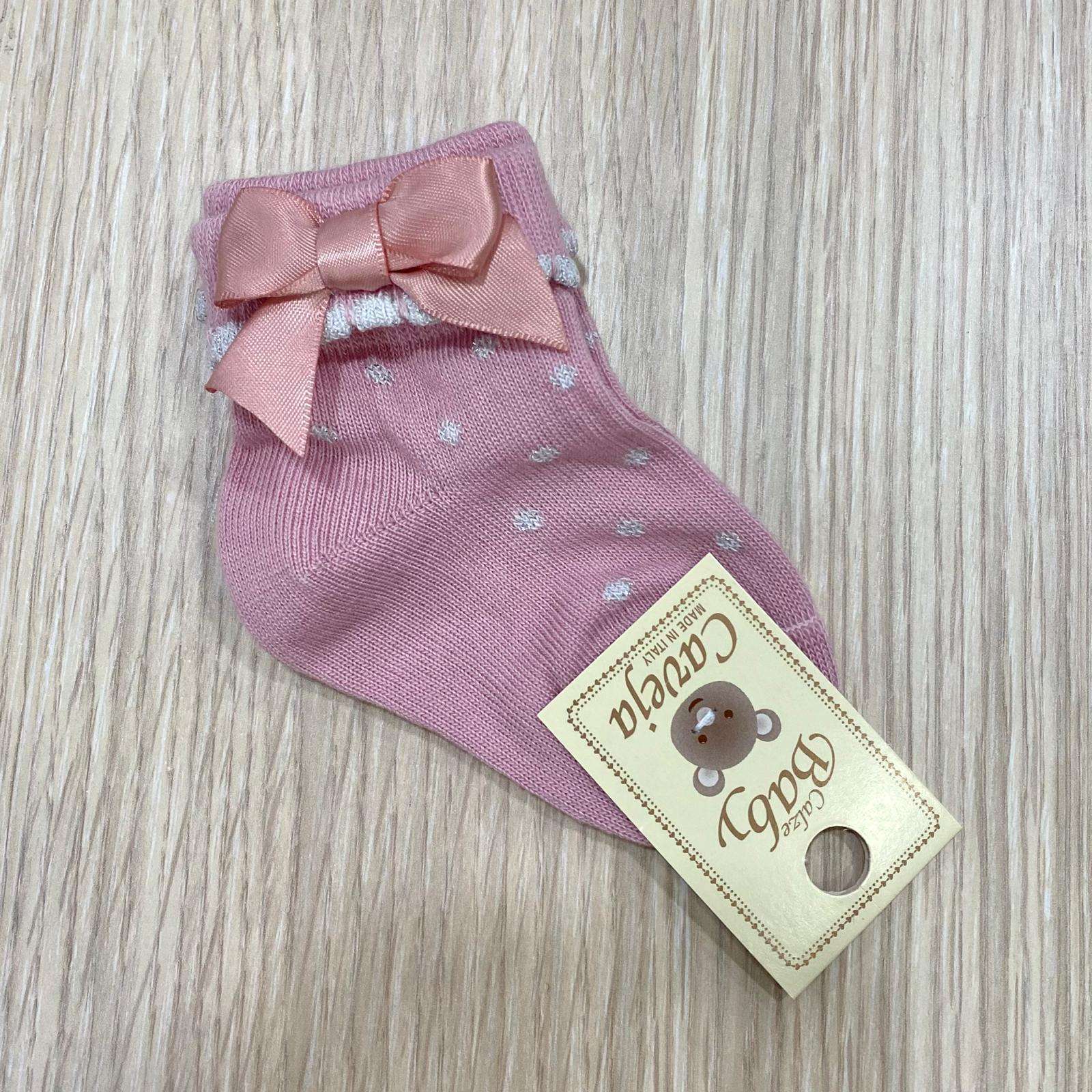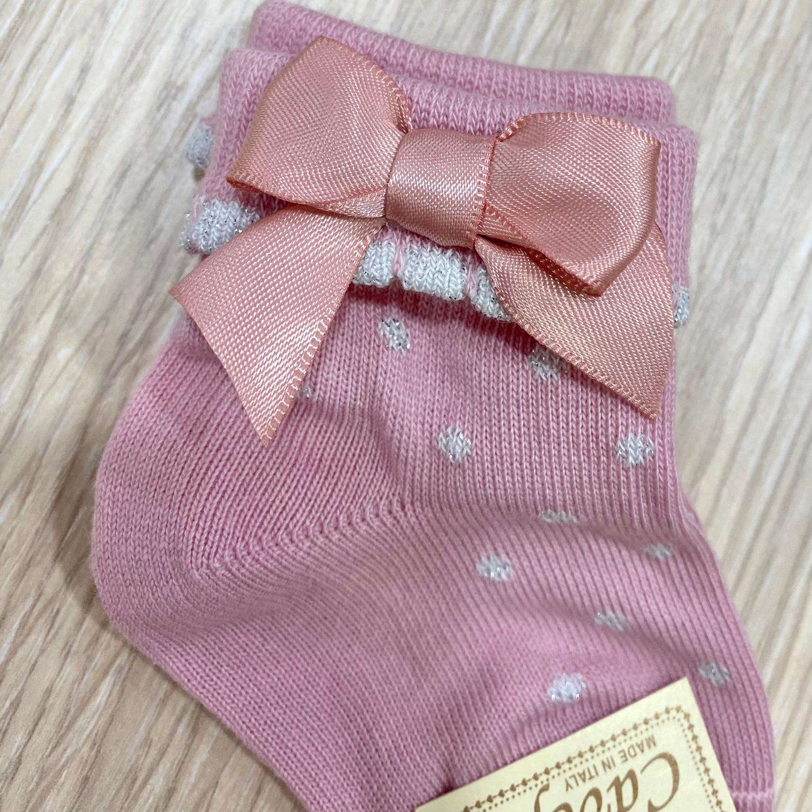 Calzino neonata/bambina in caldo cotone, di colore rosa antico, con dettagli argentati e applicazione di fiocchetto.