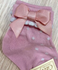 Calzino neonata/bambina in caldo cotone, di colore rosa antico, con dettagli argentati e applicazione di fiocchetto.