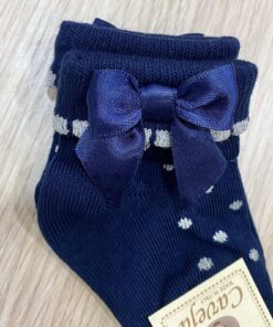 Calzino neonata/bambina in caldo cotone, di colore blu, con dettagli argentati e applicazione di fiocchetto.