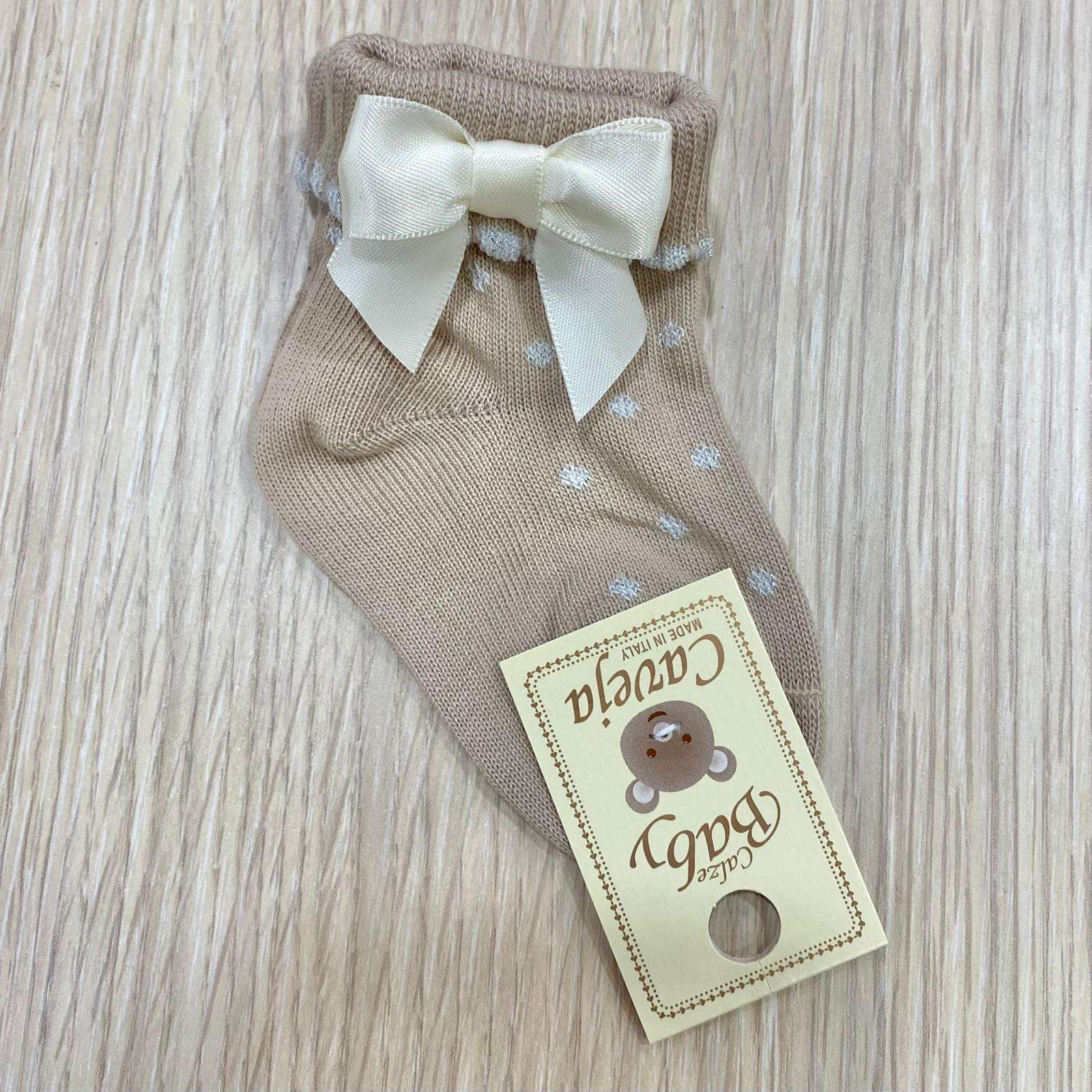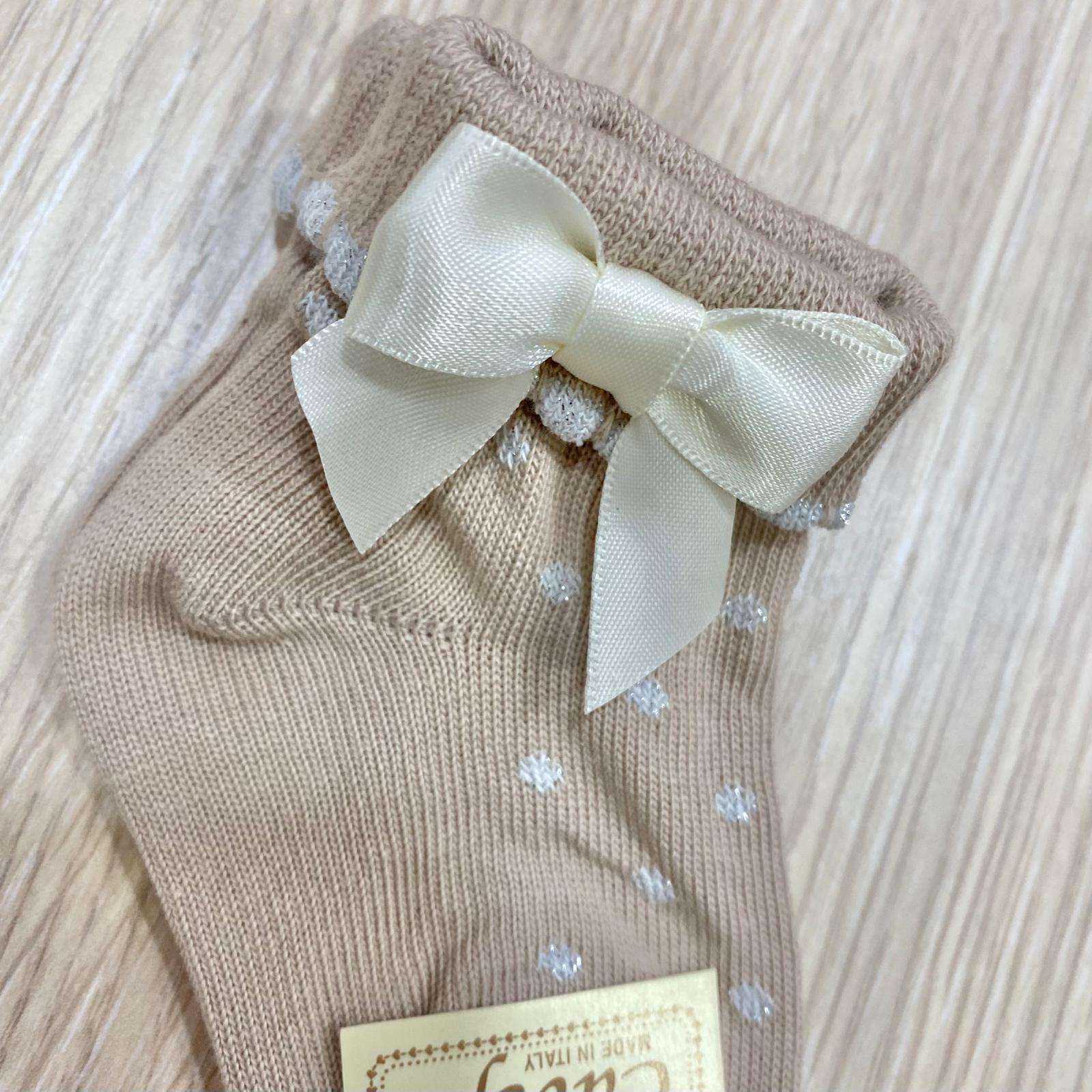 Calzino neonata/bambina in caldo cotone, di colore beige, con dettagli argentati e applicazione di fiocchetto.