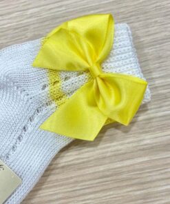 Calzino neonata/bambina in morbido filo makò di cotone, di colore bianco, con fiocco laterale in raso di colore giallo.