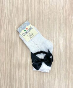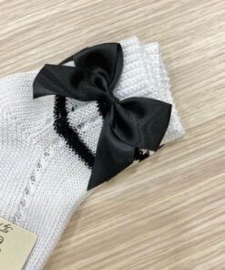 Calzino neonata/bambina in morbido filo makò di cotone, di colore bianco, con fiocco laterale in raso di colore nero.