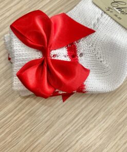 Calzino neonata/bambina in morbido filo makò di cotone, di colore bianco, con fiocco laterale in raso di colore rosso.