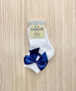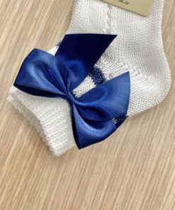 Calzino neonata/bambina in morbido filo makò di cotone, di colore bianco, con fiocco laterale in raso di colore blu.