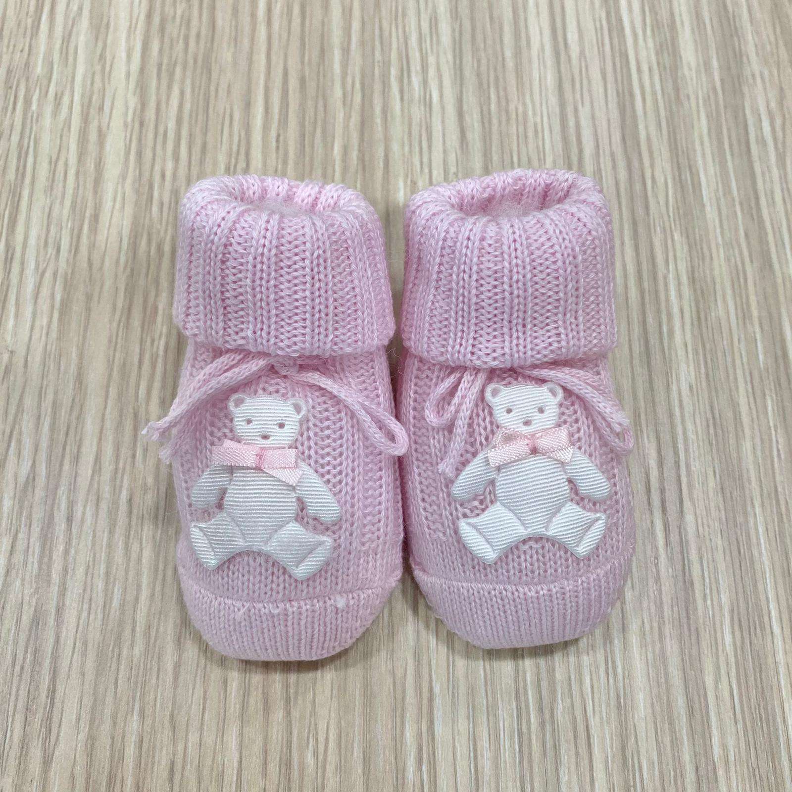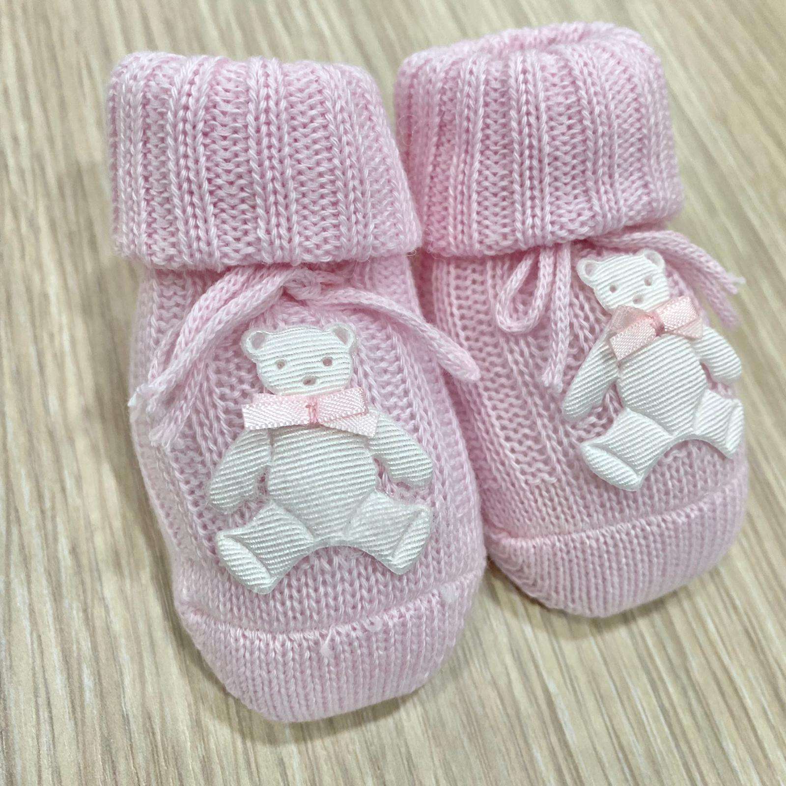 Calzino neonata in caldo cotone, di colore rosa, con applicazione in rilievo.