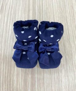 Calzino neonata in caldo cotone, di colore blu con fiocchetto in raso e pois di colore bianco.