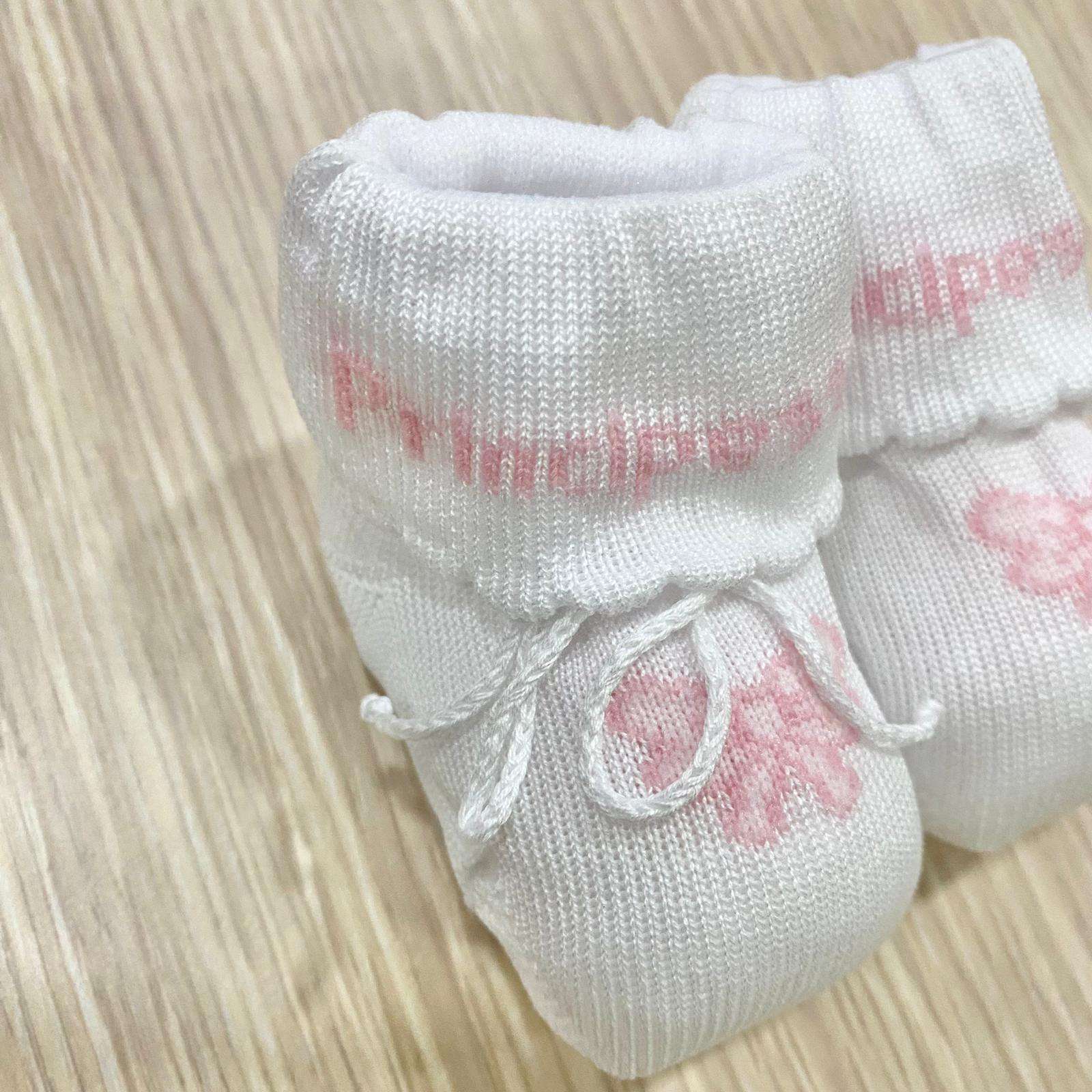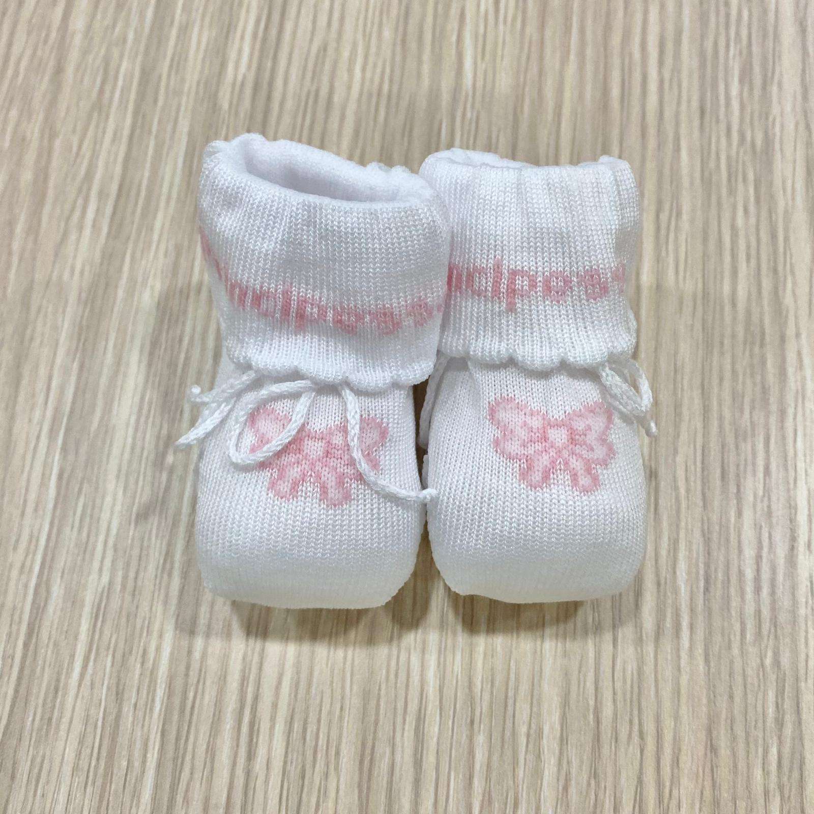 Calzino neonata in cotone, di colore bianco con scritta “Principessa” e fiocco ricamato di colore rosa.
