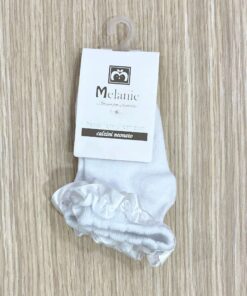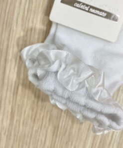 Calzino neonata in cotone, di colore bianco, con applicazione di riccetto in raso.
