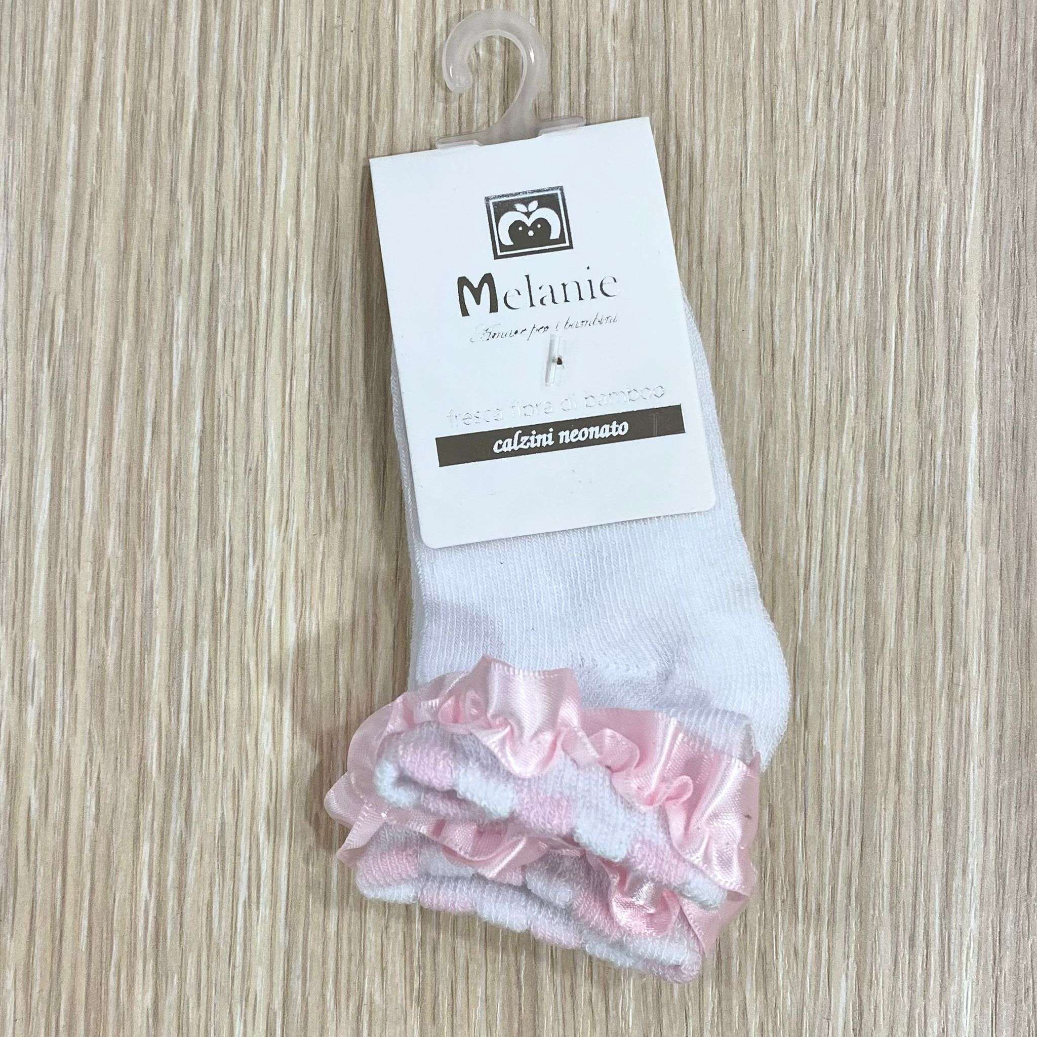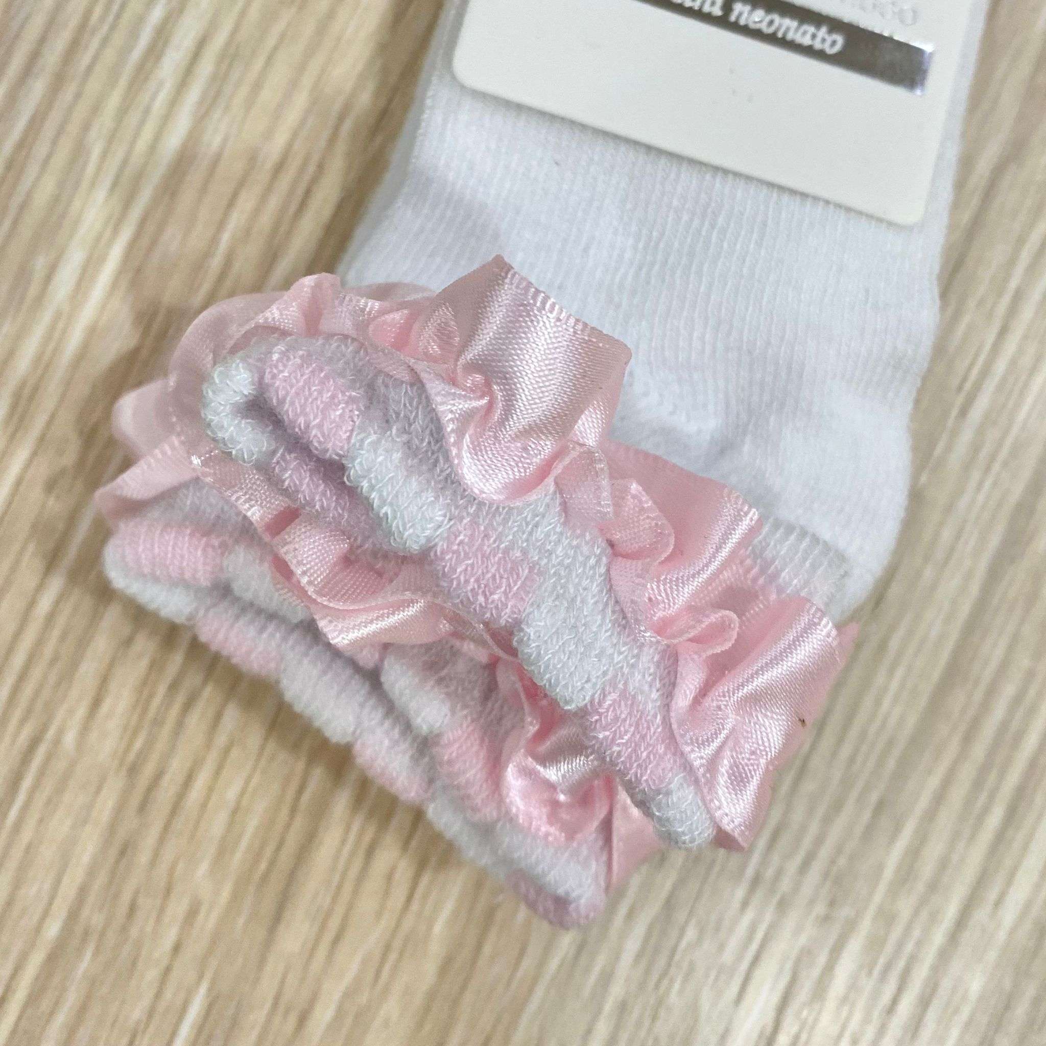 Calzino neonata in cotone, di colore bianco, con applicazione di riccetto in raso di colore rosa.