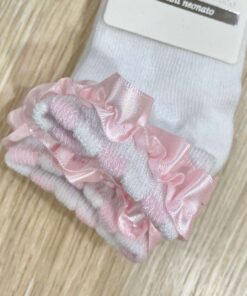 Calzino neonata in cotone, di colore bianco, con applicazione di riccetto in raso di colore rosa.