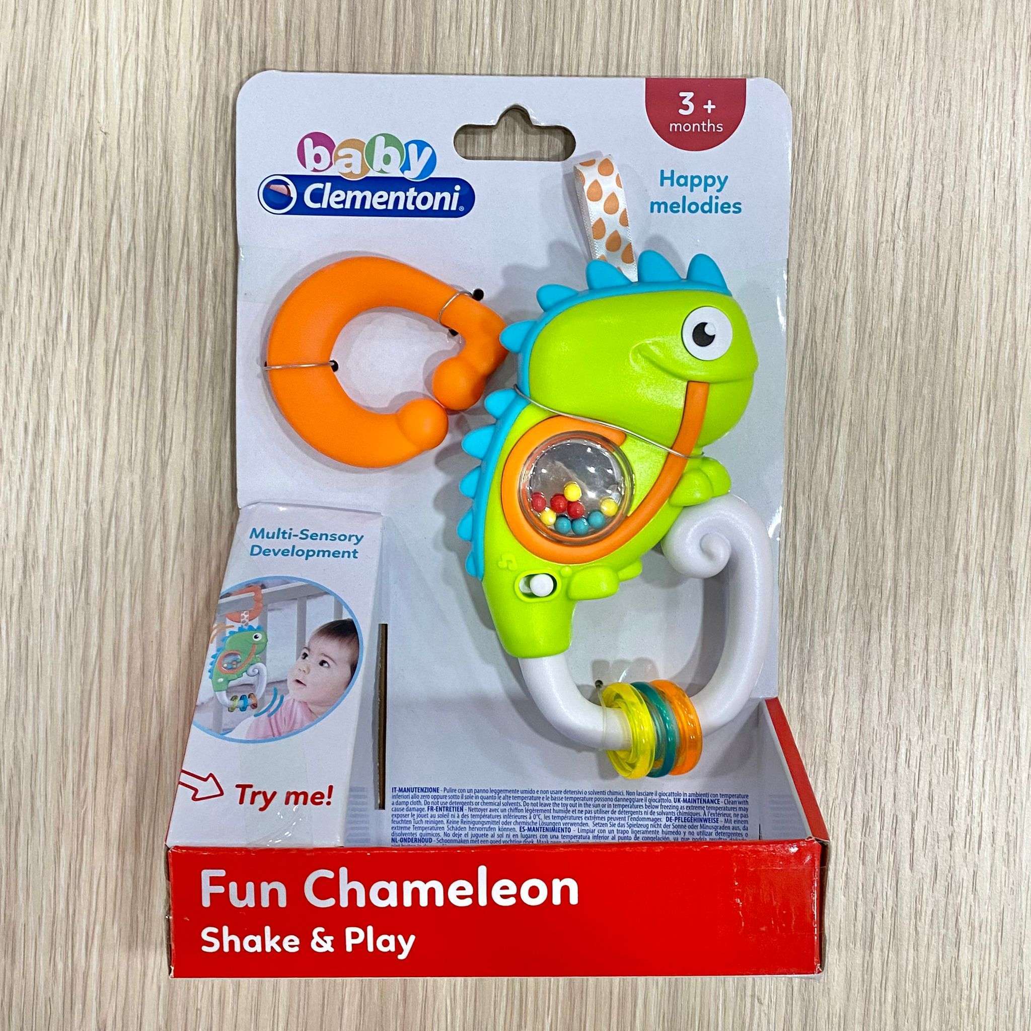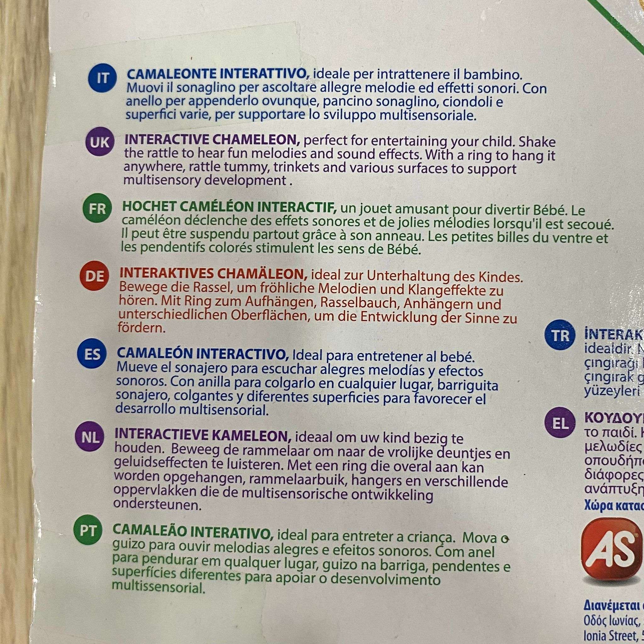 •  Muovendolo il sonaglino attiva allegre melodie ed effetti sonori, mentre le palline nella pancia del camaleonte e i ciondoli colorati attirano l’attenzione del bambino stimolando la percezione tattile