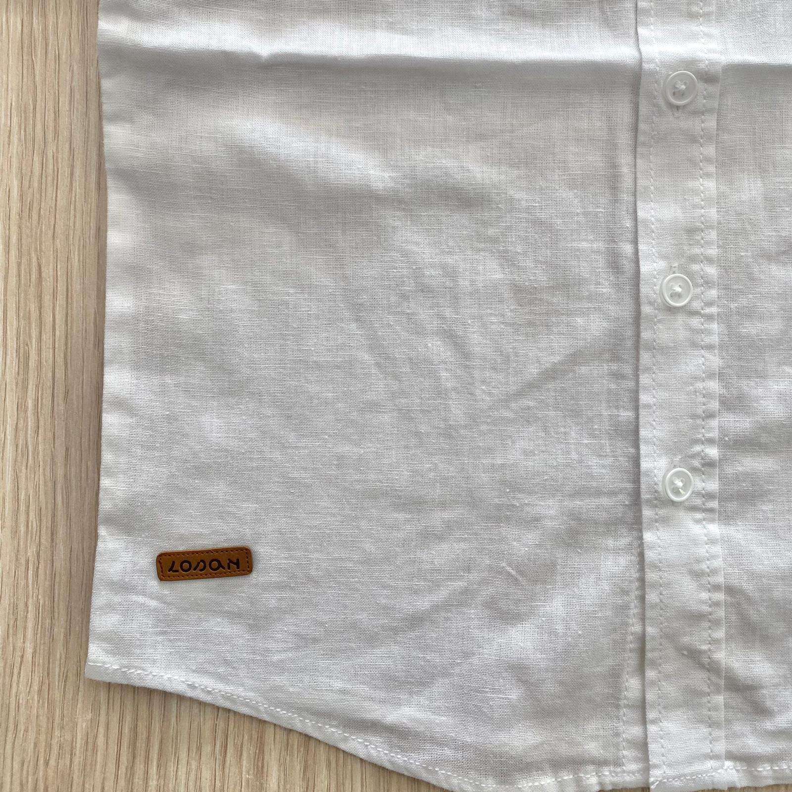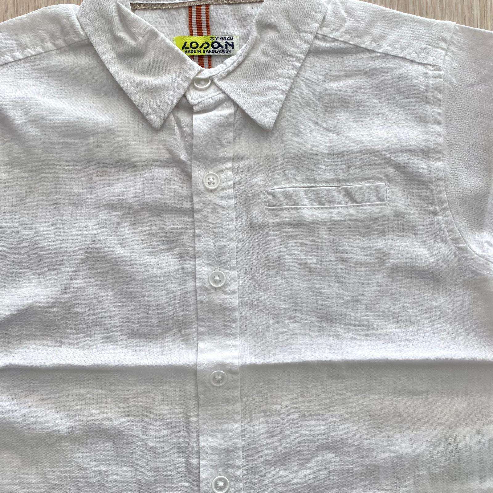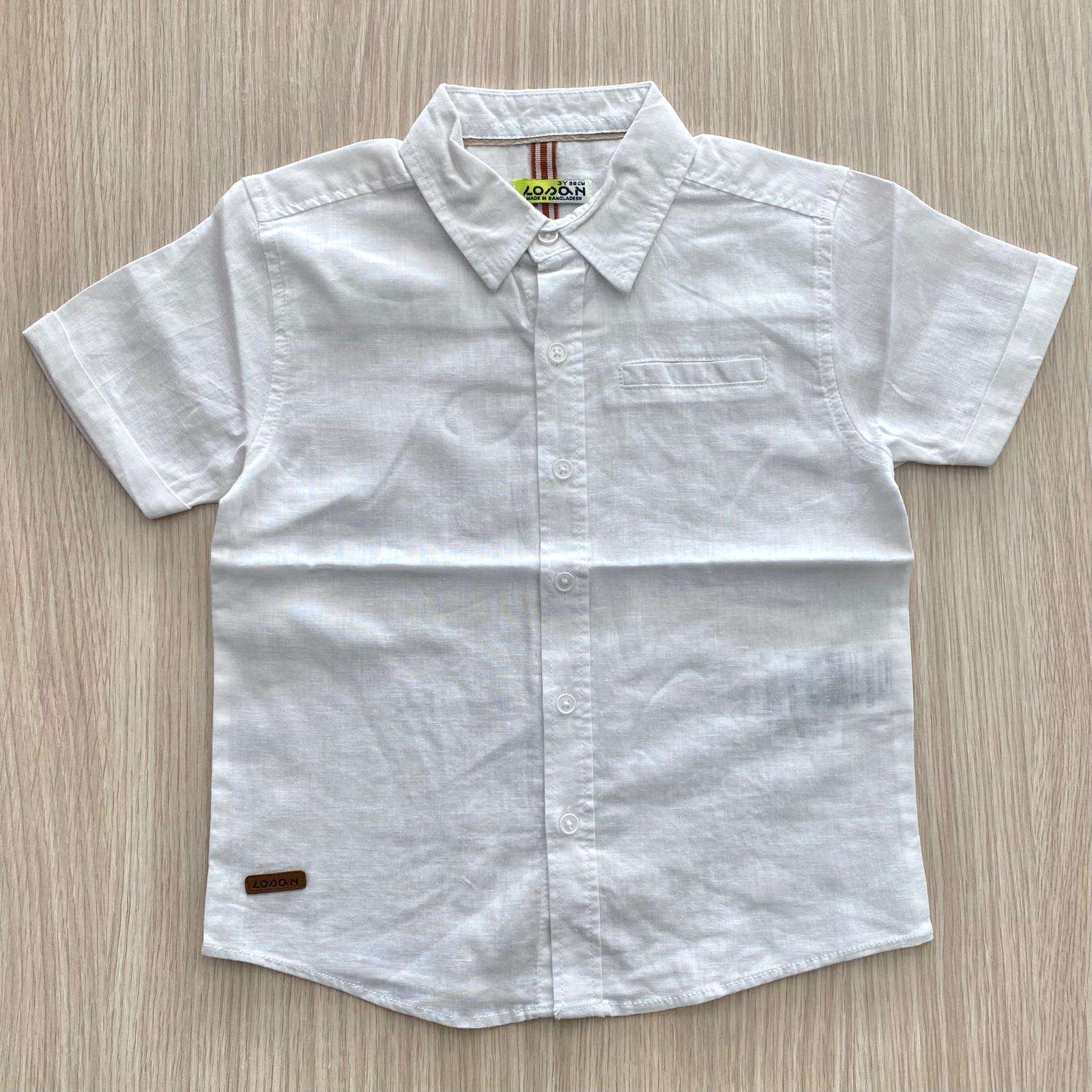 Camicia bambino in cotone misto lino, di colore bianco, con bottoncini e dettaglio di finto taschino.