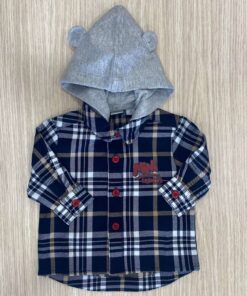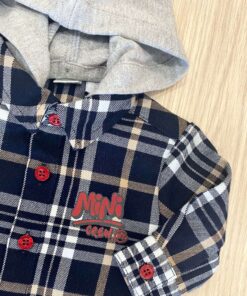 Camicia neonato/bambino in caldo cotone, di colore blu, grigio e dettagli di colore rosso. Camicia con cappuccio removibile.