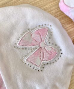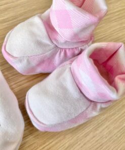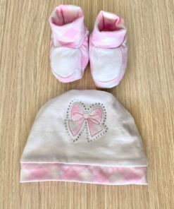 Cappellino e babbucce neonata/bambina in cotone di colore bianco e rosa, con applicazione di strass.