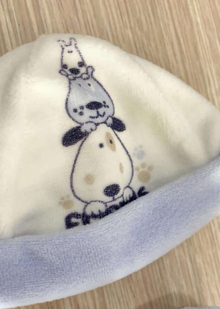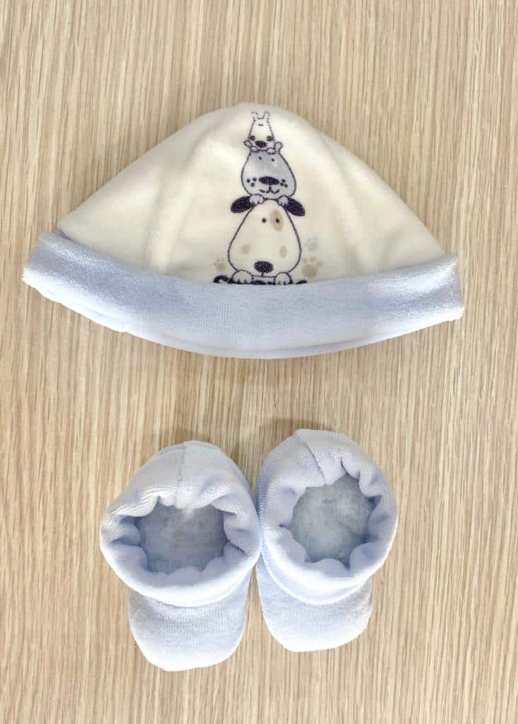 Cappellino e babbucce neonato in ciniglia, di colore latte e celeste con disegno.