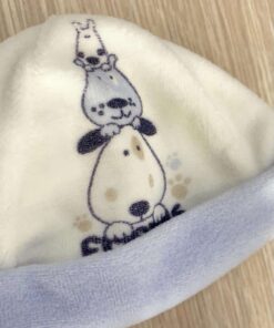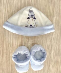 Cappellino e babbucce neonato in ciniglia, di colore latte e celeste con disegno.