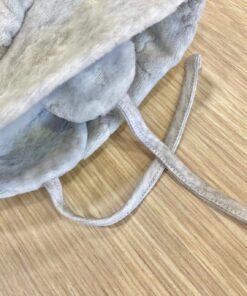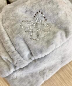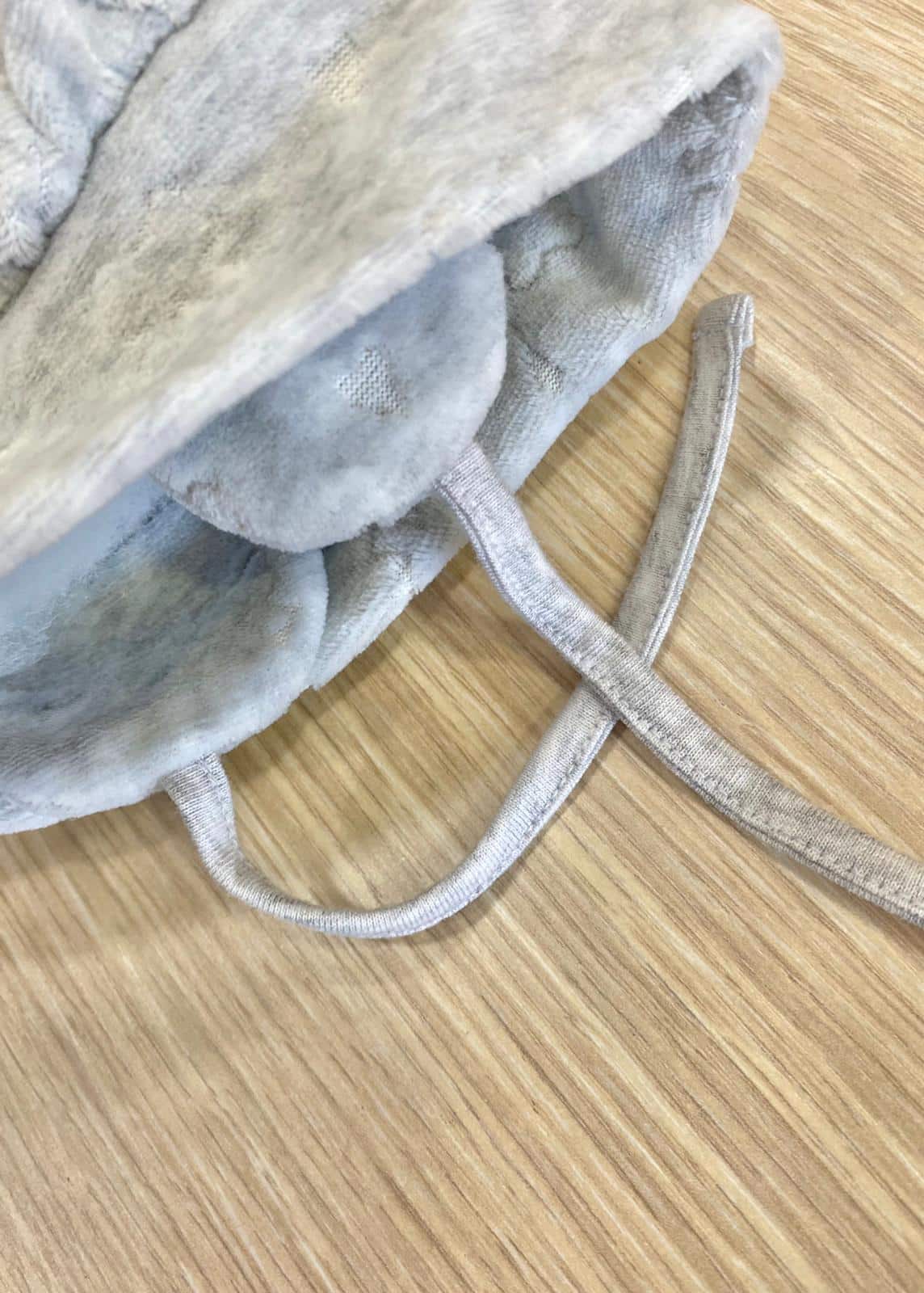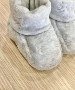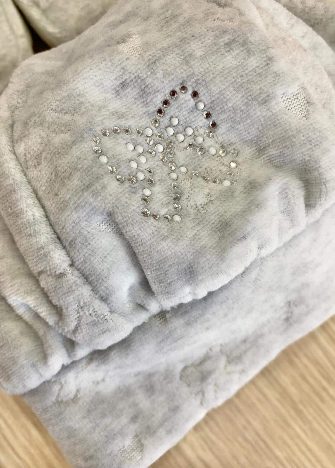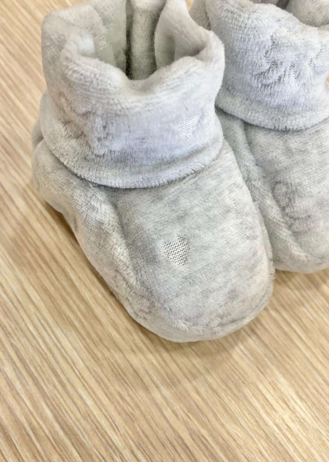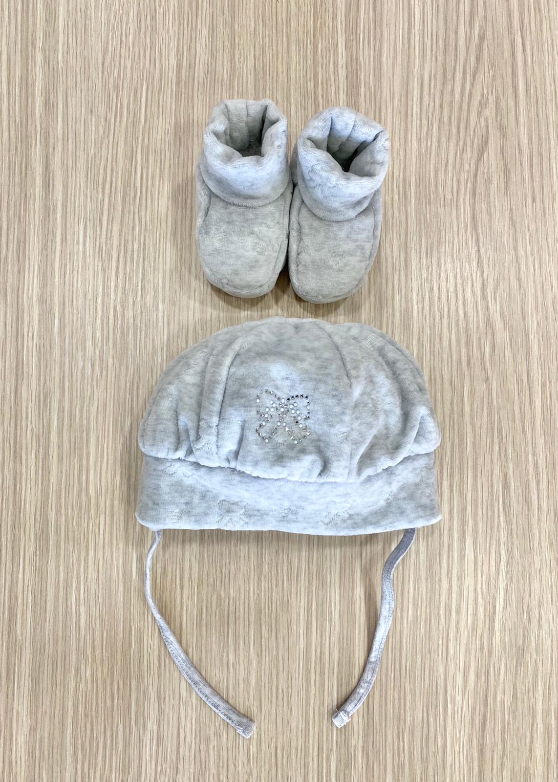 Cappellino e babbucce neonata in morbida ciniglia di cotone di colore grigio con applicazioni di strass.