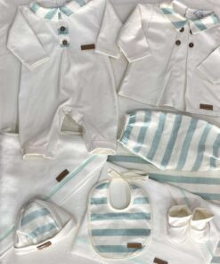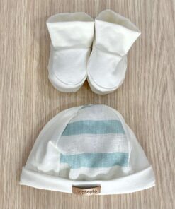 Cappellino e babbucce neonato in cotone, di colore panna e turchese.
