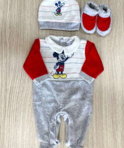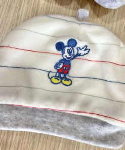 Cappellino e babbucce neonato in ciniglia, di colore panna e grigio, con ricamo Mickey Mouse e disegni di vari colori.