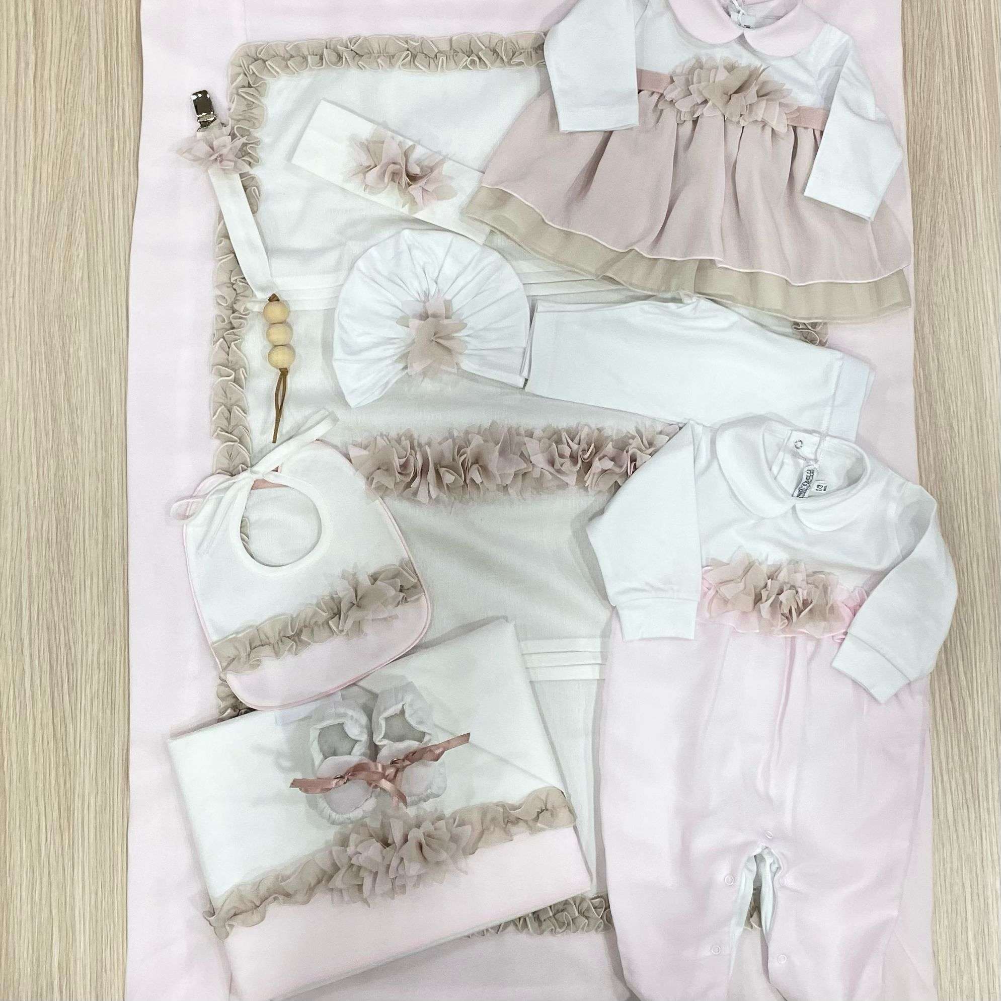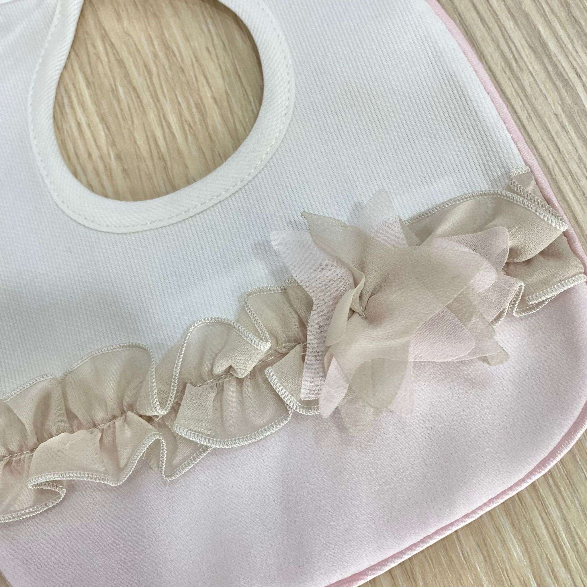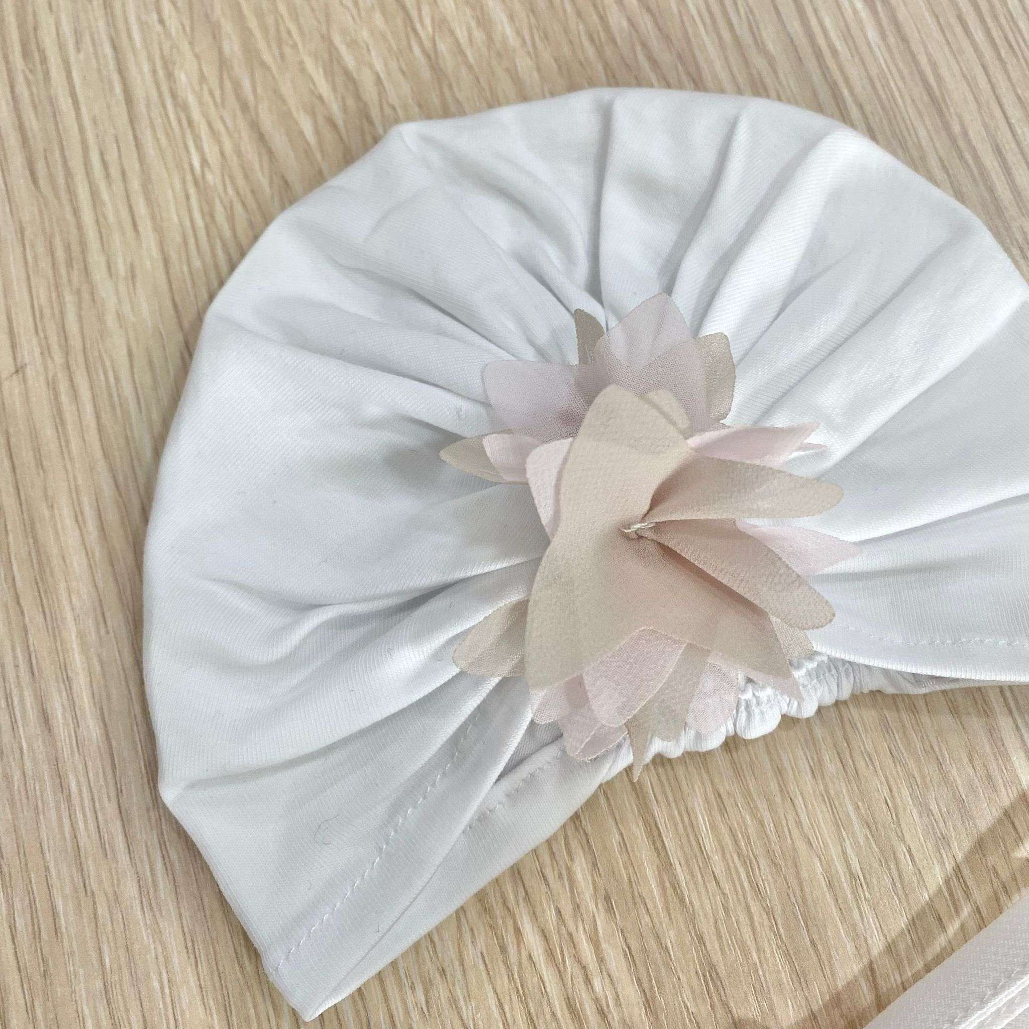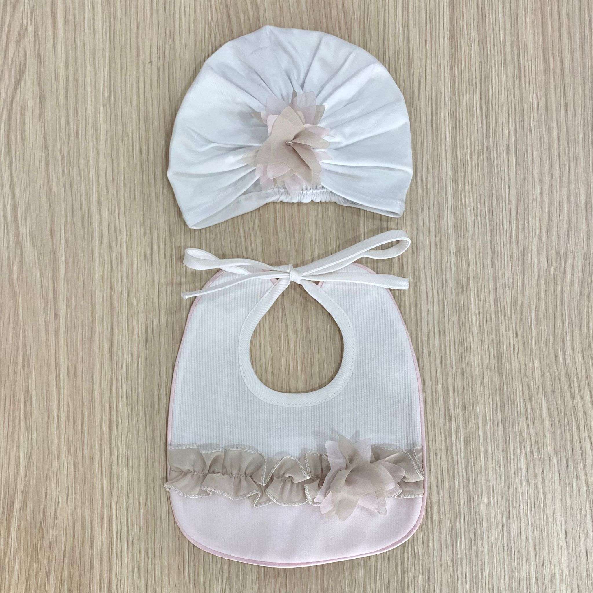 Cappellino a turbante e bavetta neonata in cotone, di colore bianco, panna rosa e beige, con dettaglio di fiorellini in organza.