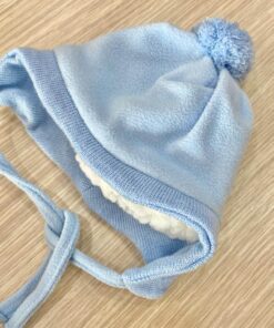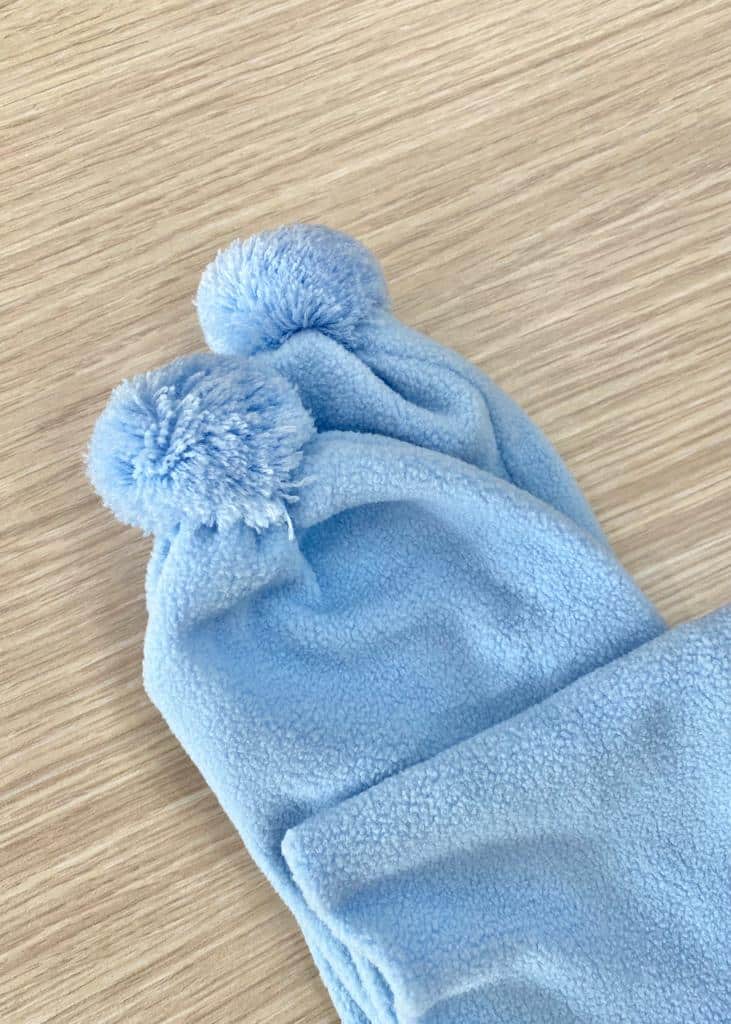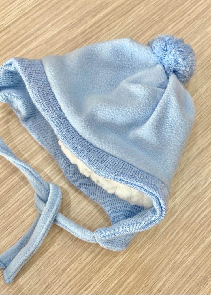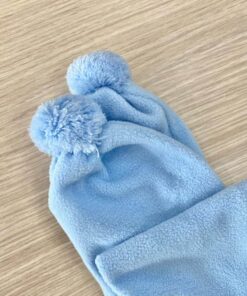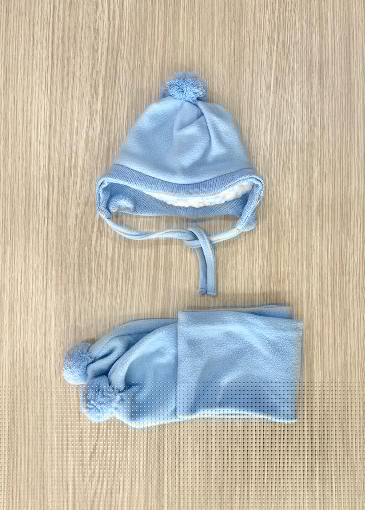 Cappellino in pile con copriorecchie e sciarpa neonato in morbido pile cinigliato di colore azzurro.