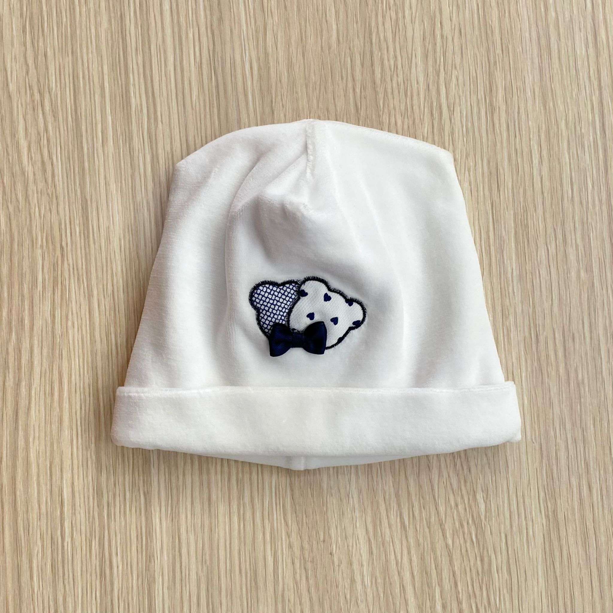 Cappellino neonato/a in ciniglia di colore bianco con dettaglio di colore blu in rilievo.