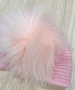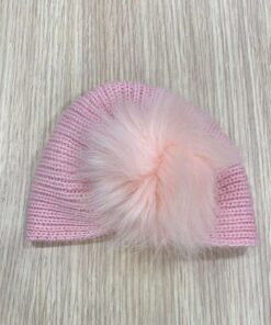 Cappellino turbante neonata in lana, di colore rosa, con pompon in rilievo.