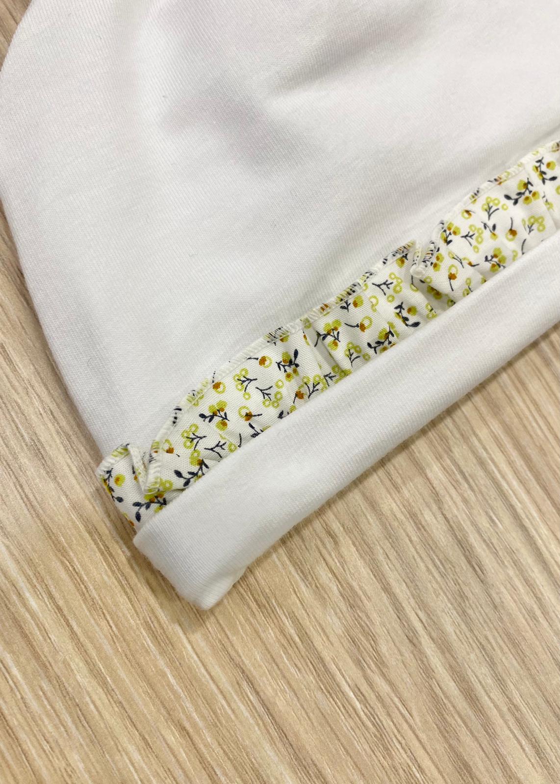 Cappellino neonata in cotone, di colore bianco e verde con disegni di fiorellini.
