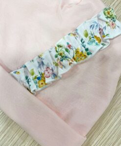 Cappellino neonata in cotone, di colore rosa con dettaglio di riccetto in tessuto di vari colori.