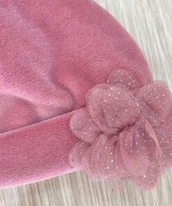 Cappellino neonata in ciniglia, di colore ortensia con dettagli di colore oro, applicazione di fiorellino in organza.