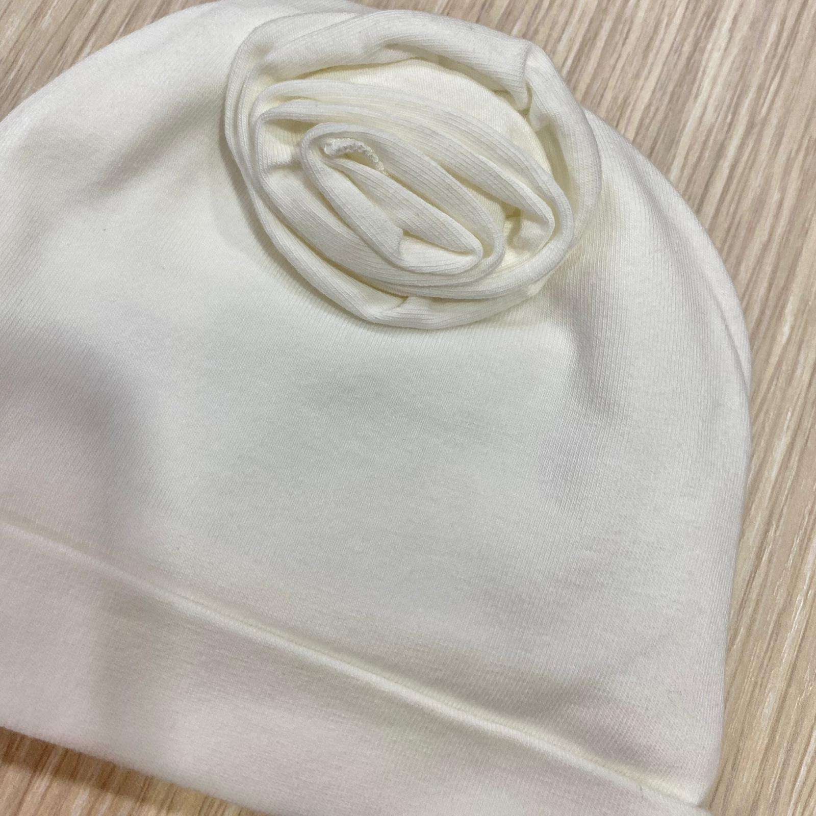 Cappellino neonata in cotone, di colore panna, con applicazione di fiorellino in tessuto.