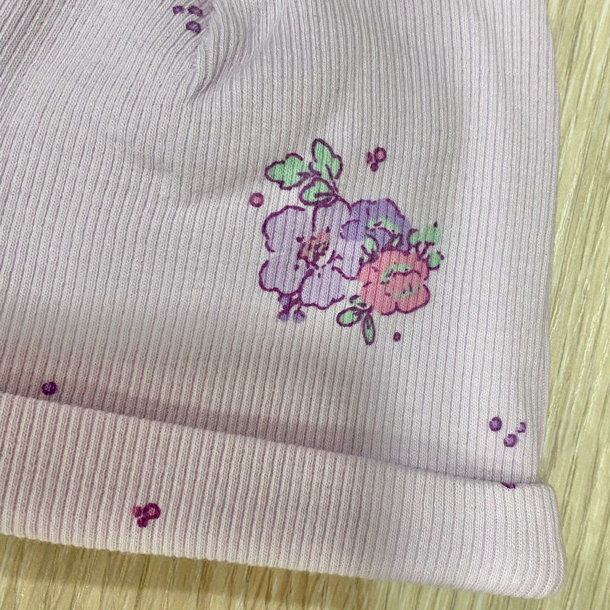 Cappellino neonata in cotone a costine, di colore lilla, con disegni floreali di vari colori.