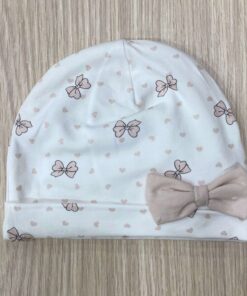 Cappellino neonata firmato iDO ,in cotone di colore bianco con bellissime stampe di fiocchetti e cuoricini rosa, ad abbellire il cappellino sul risvoltino applicazione di fiocchetto rosa chiaro.