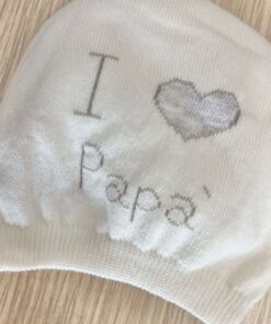 Cappellino neonato/a in caldo cotone, di colore ecrù e grigio.