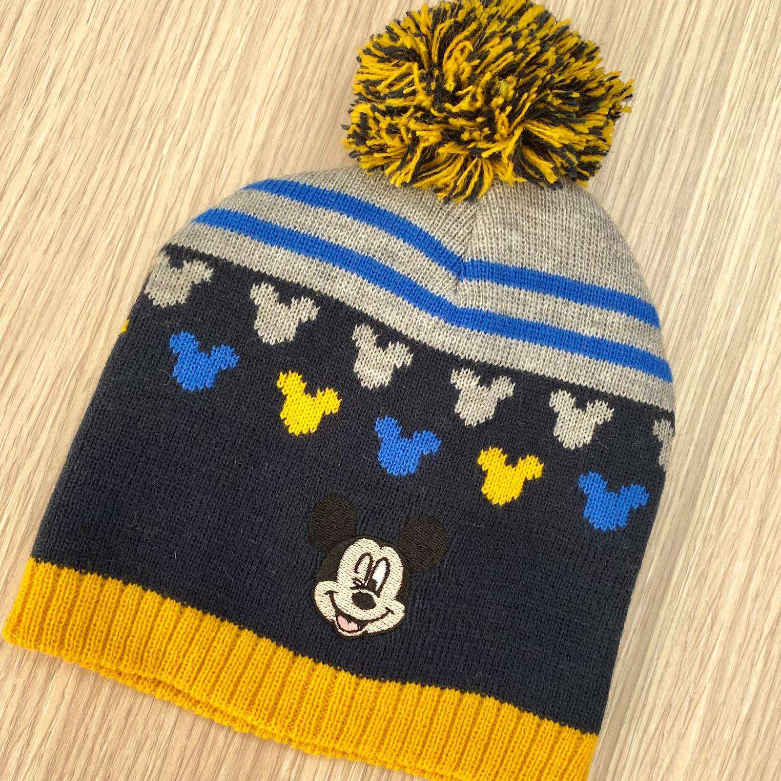 Cappellino neonato/bambino in caldo tessuto, di colore blu e giallo, con dettagli e disegno ricamato di vari colori.