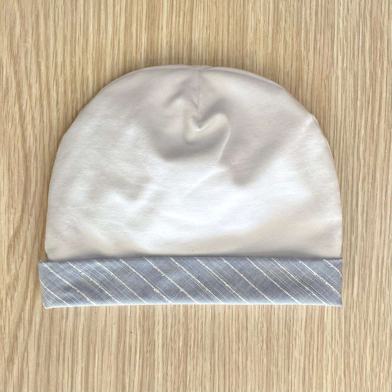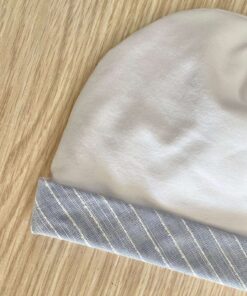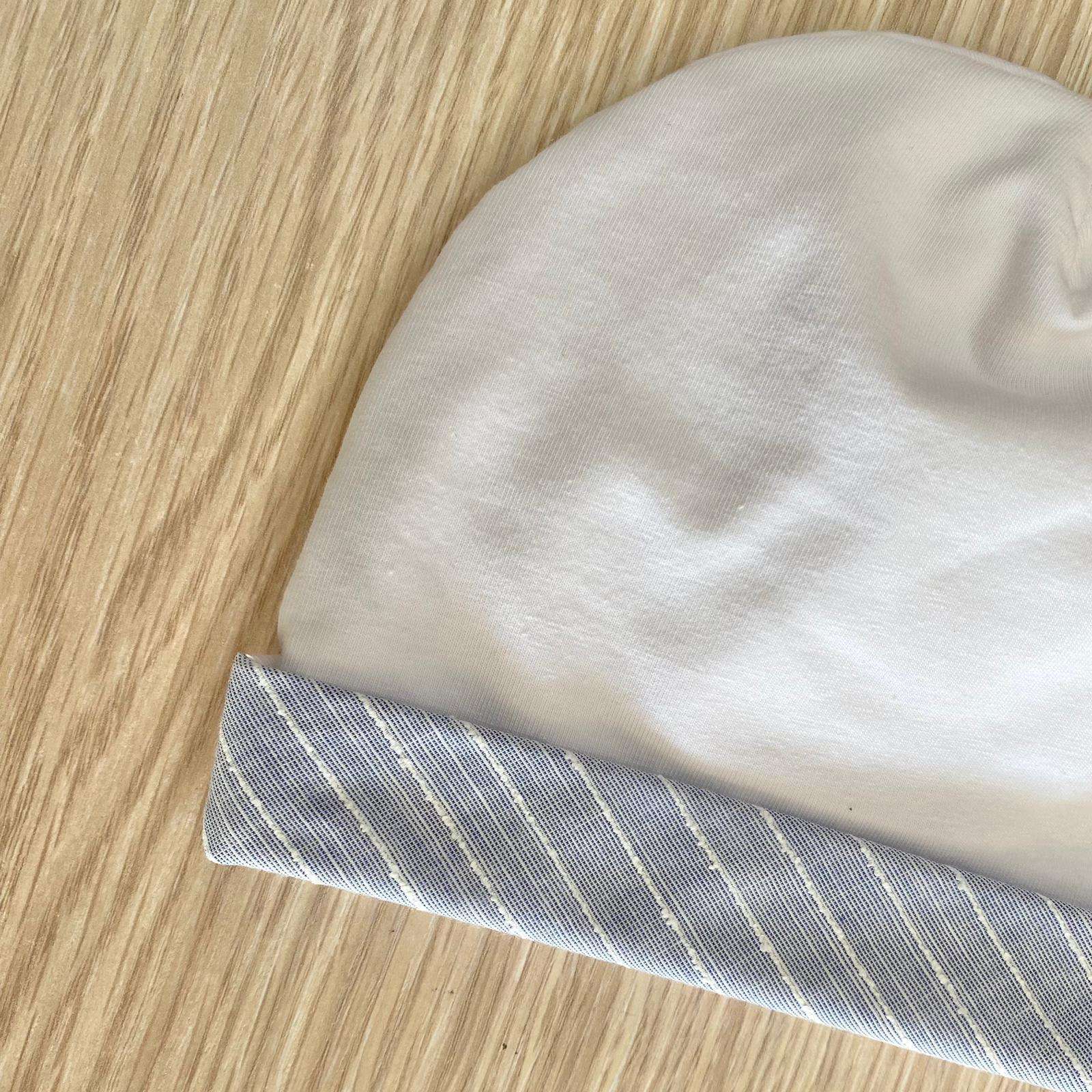 Cappellino neonato in cotone, di colore bianco e azzurro.