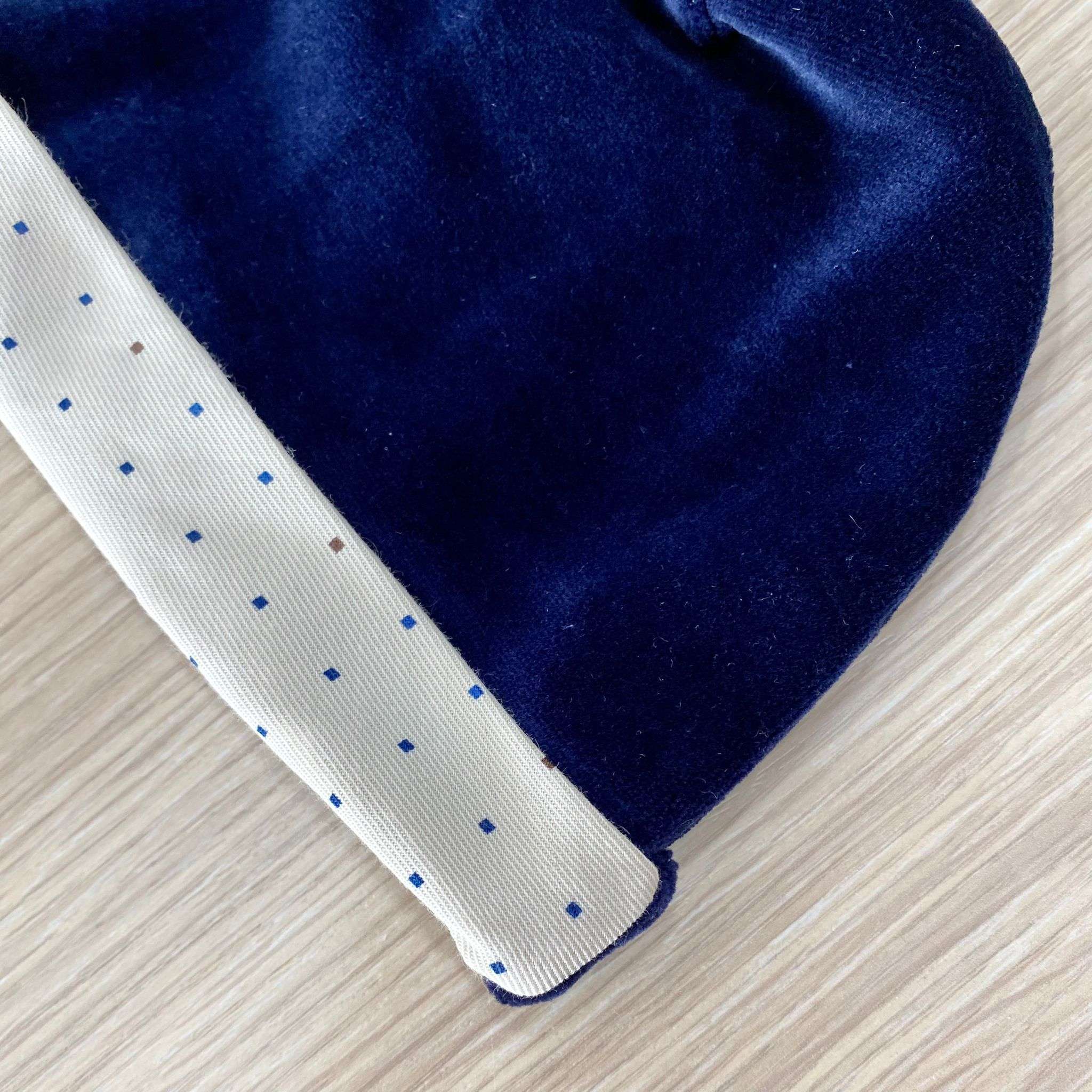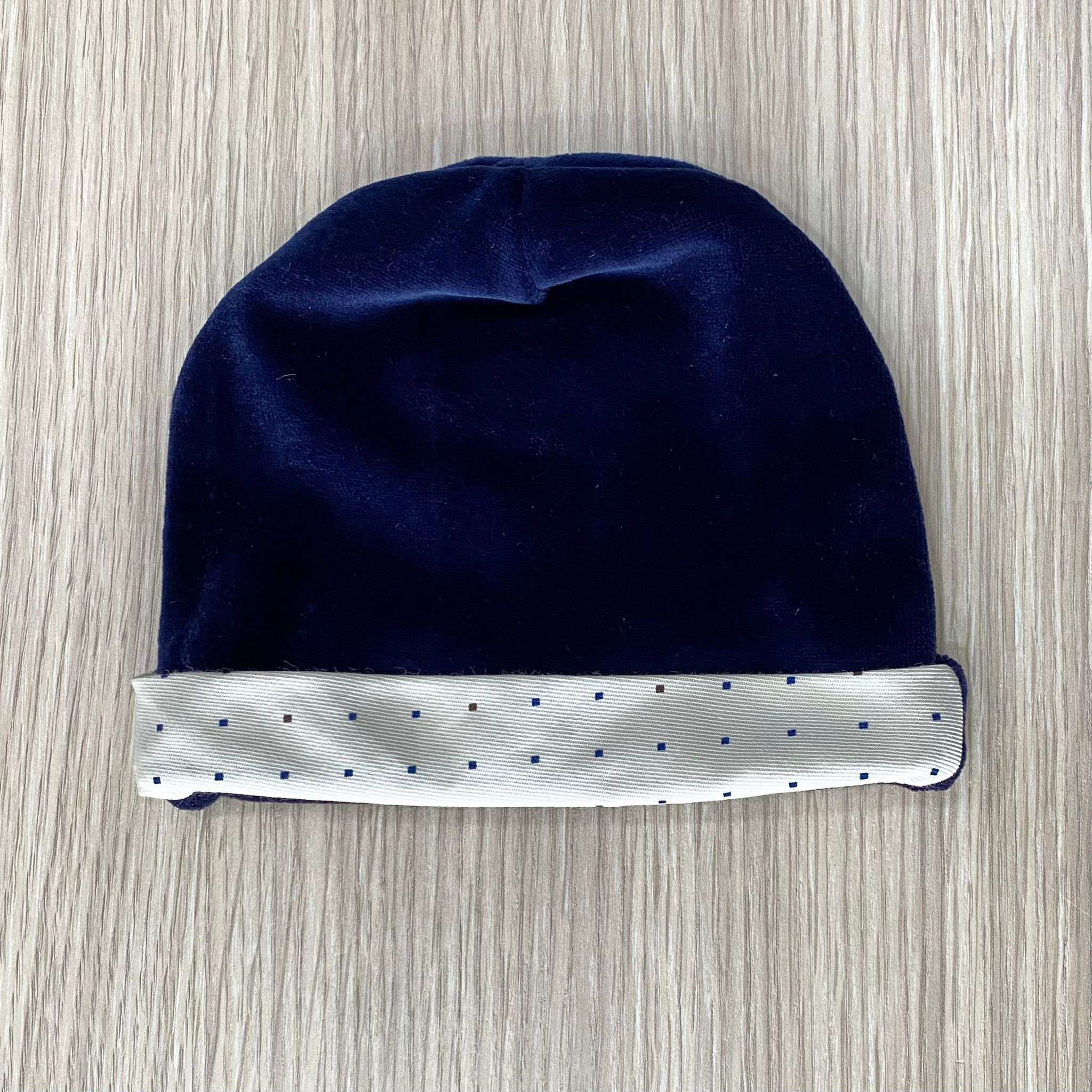 Cappellino neonato in ciniglia, di colore blu e beige chiaro.