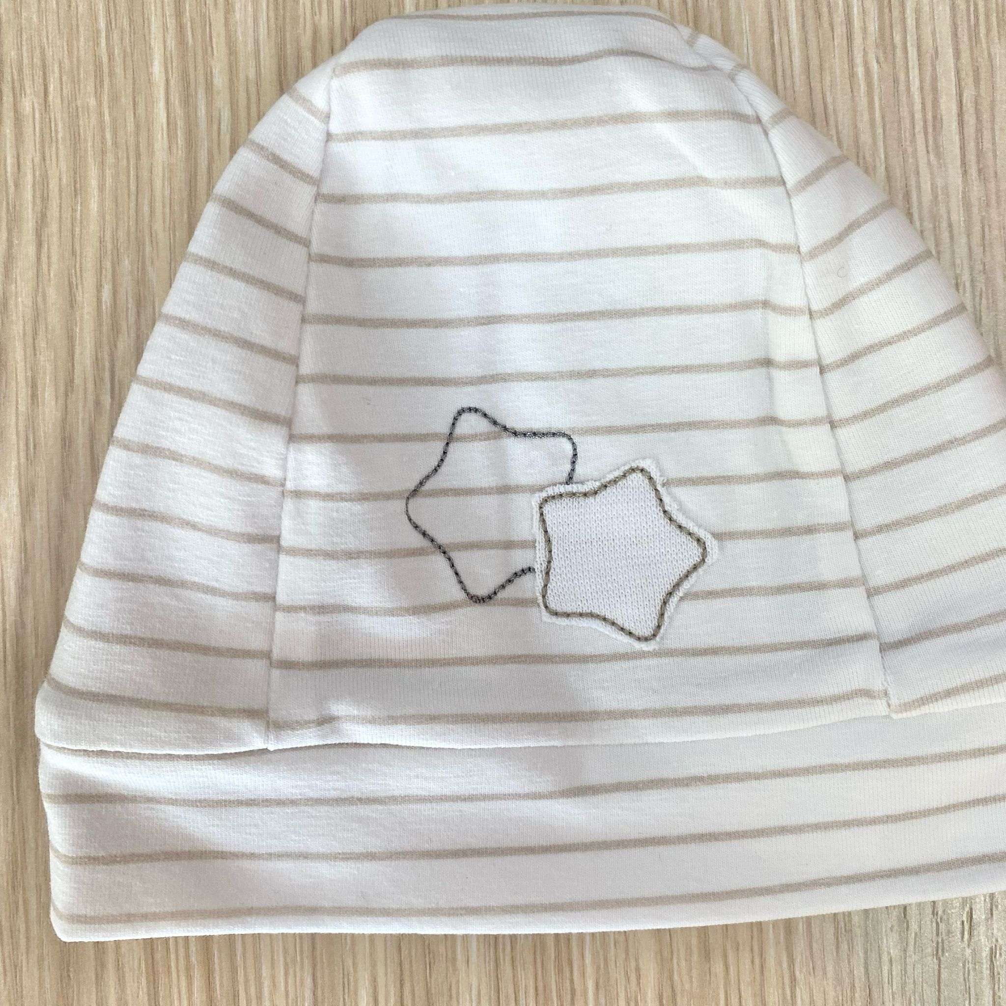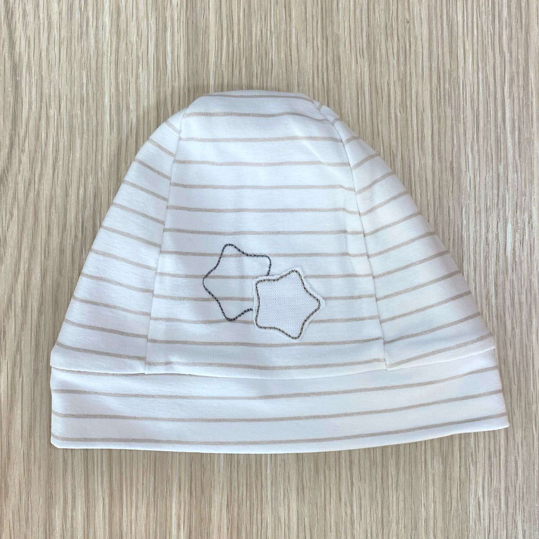 Cappellino neonato in cotone, di colore bianco e sabbia, con disegno ricamato.