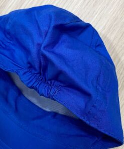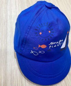Cappellino neonato in cotone, di colore blu, con stampa di vari colori. Cappellino con visiera.
