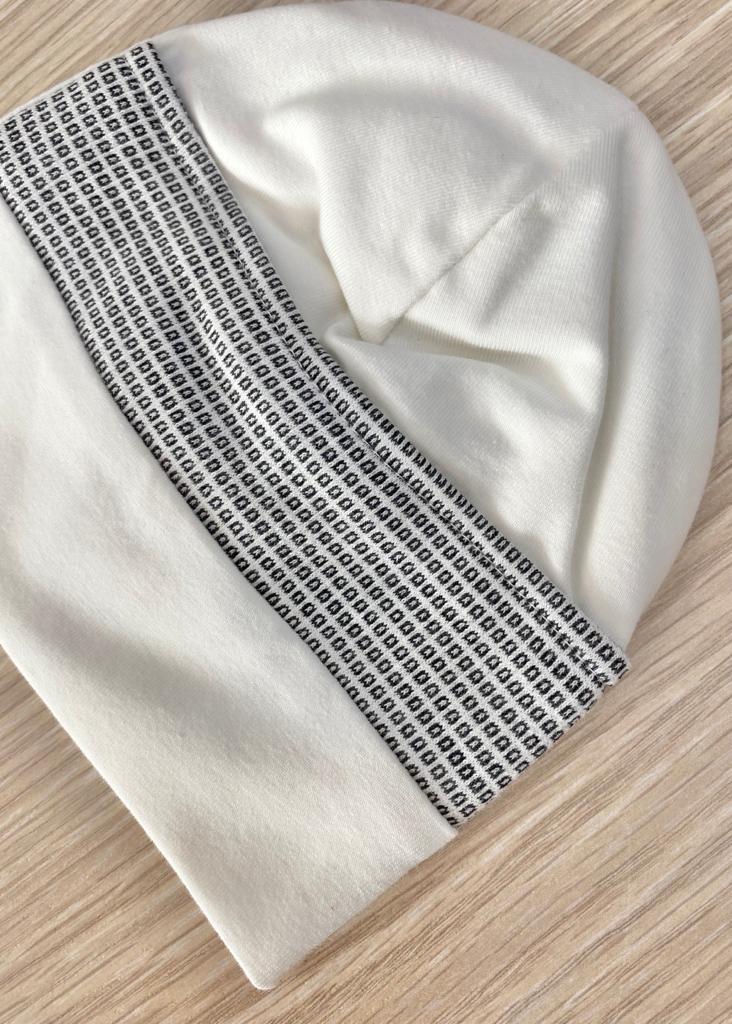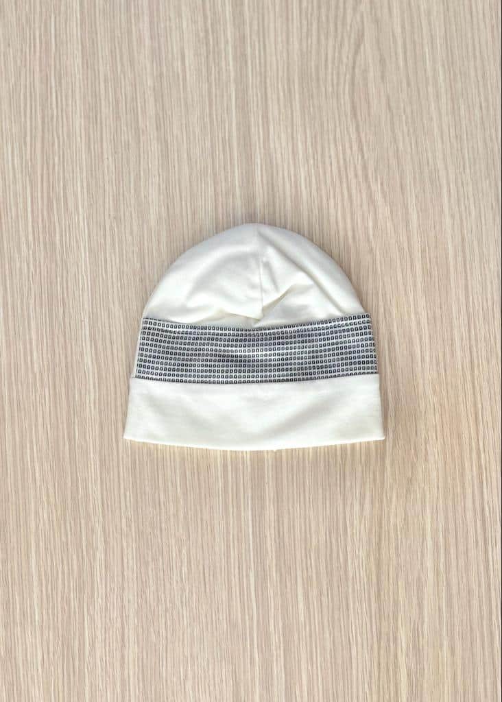 Cappellino neonato in caldo cotone, in doppio tessuto, di colore panna con dettaglio di quadretti.
