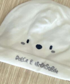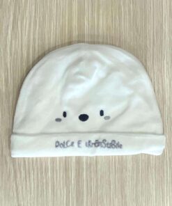 Cappellino neonato in ciniglia, di colore panna, con disegno e scritta ricamata di colore grigio.