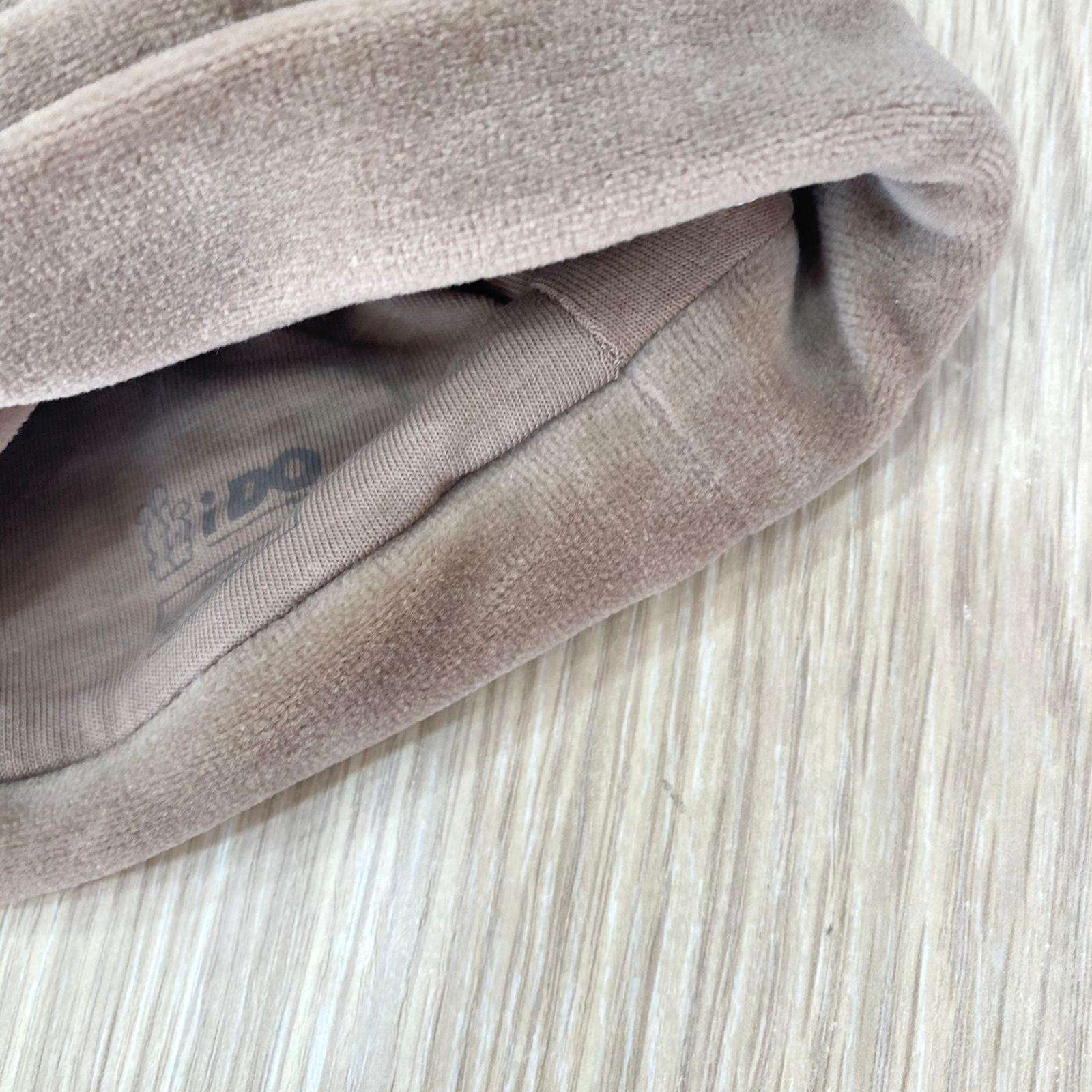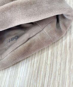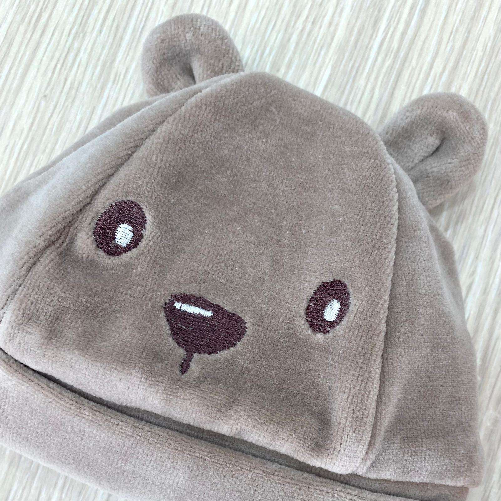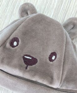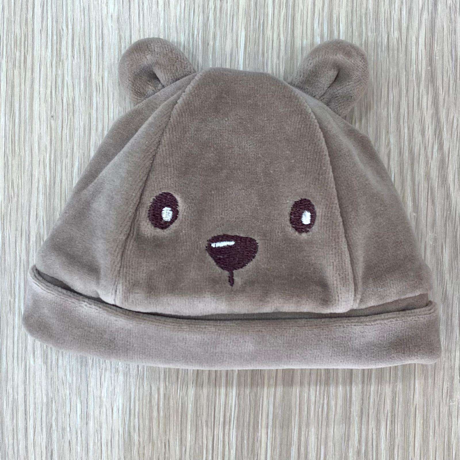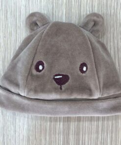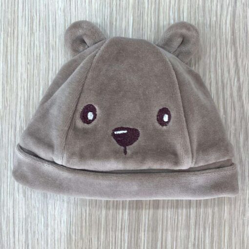 Cappellino neonato in ciniglia, di colore tortora con disegni ricamati.