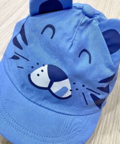 Cappello con orecchie di animale per baby bambino. Cappellino di colore celeste con stampa di tigre. Bottone decorativo nella parte superiore. Elastico sul retro.