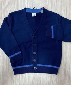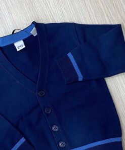 Cardigan bambino iDO, di colore blu scuro con una striscia in colore blu navy che lo rendee elegante.Questo cardigan in cotone 100% è ideale per il periodo primavera/estate.