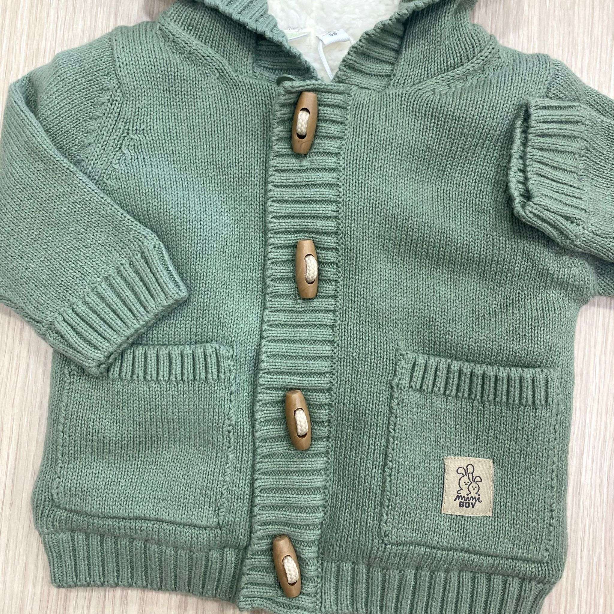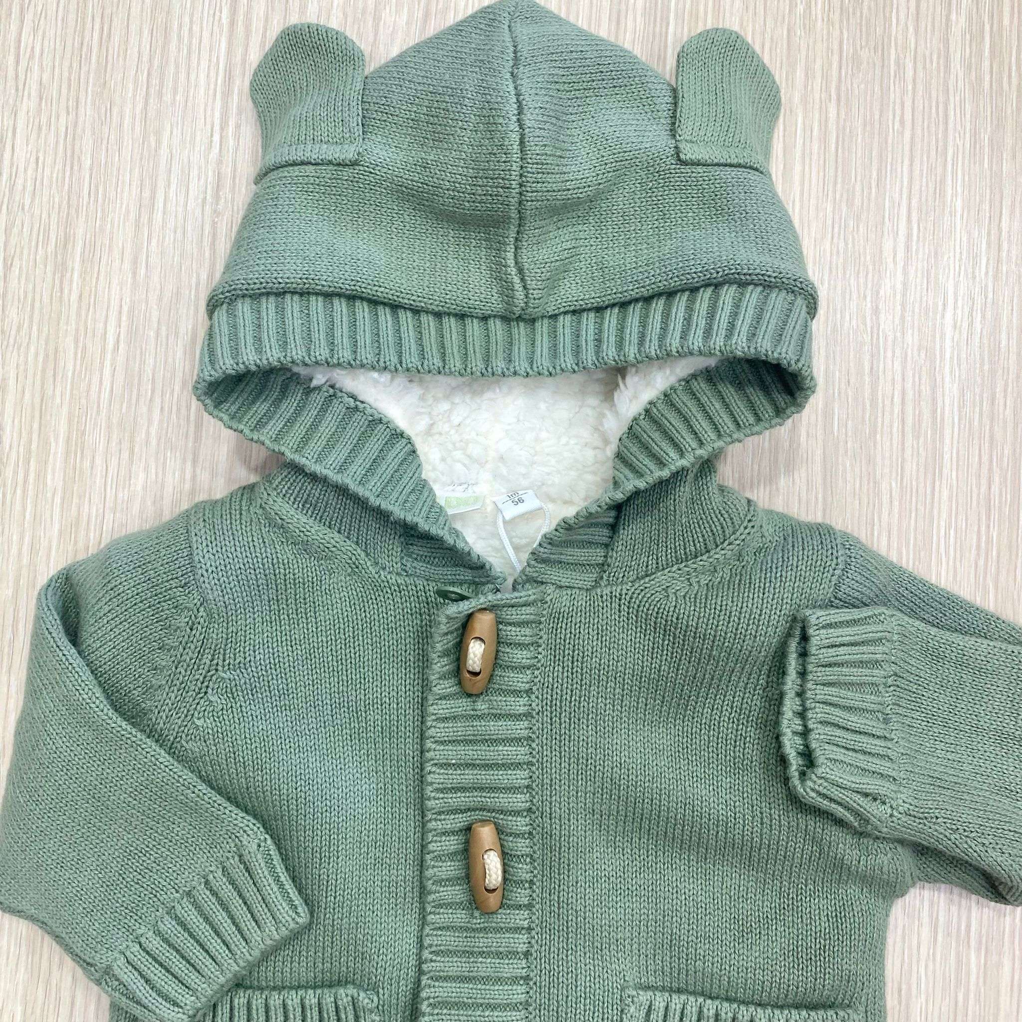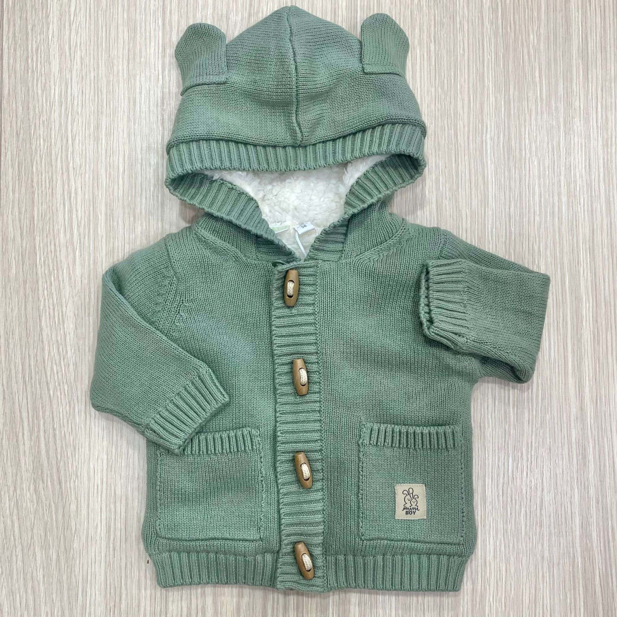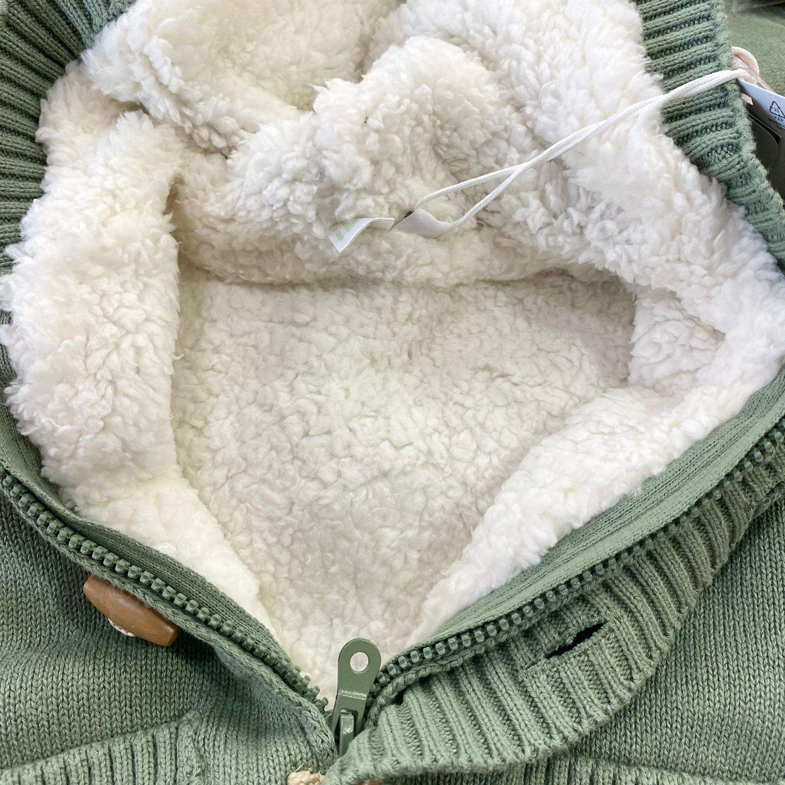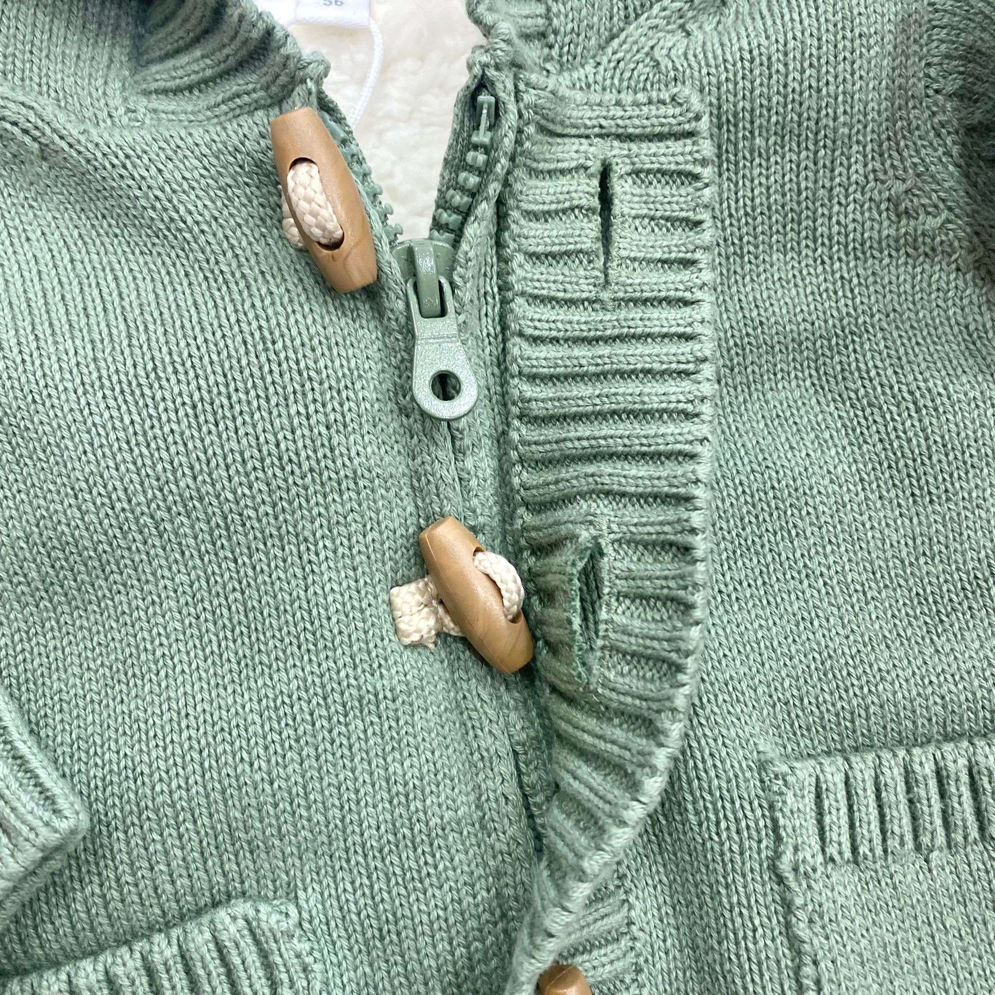 Cardigan/giacchettino neonato/bambino imbottito di colore verde salvia e bianco, con chiusura con cerniera e alamari in legno e tasche frontali. Cardigan con cappuccio e orecchie decorative.